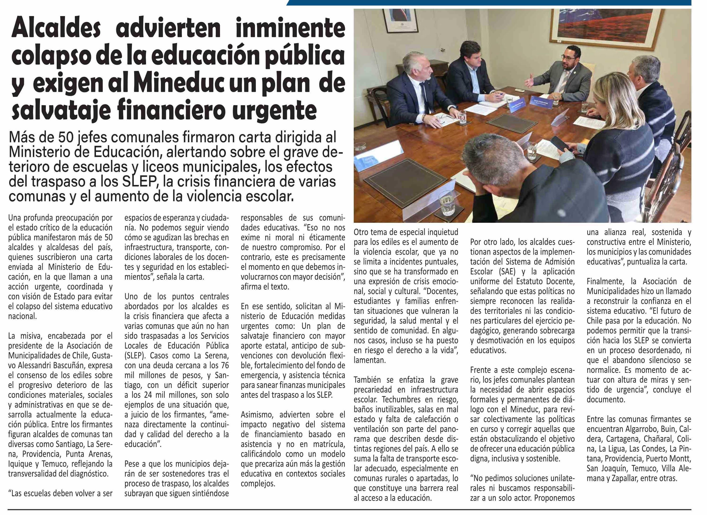 Título: Alcaldes advierten inminente colapso de la educación pública y exigen al Mineduc un plan de salvataje financiero urgente