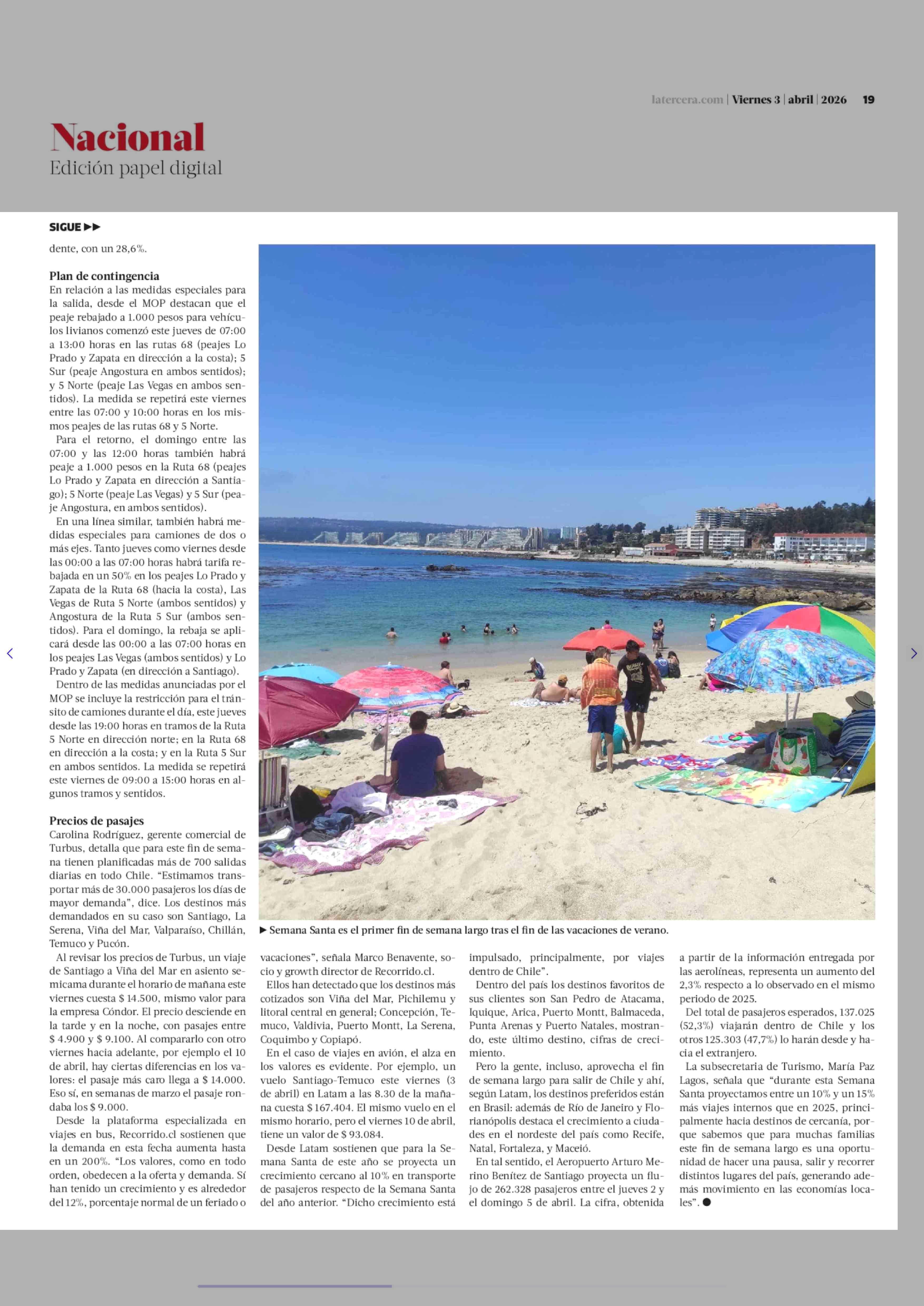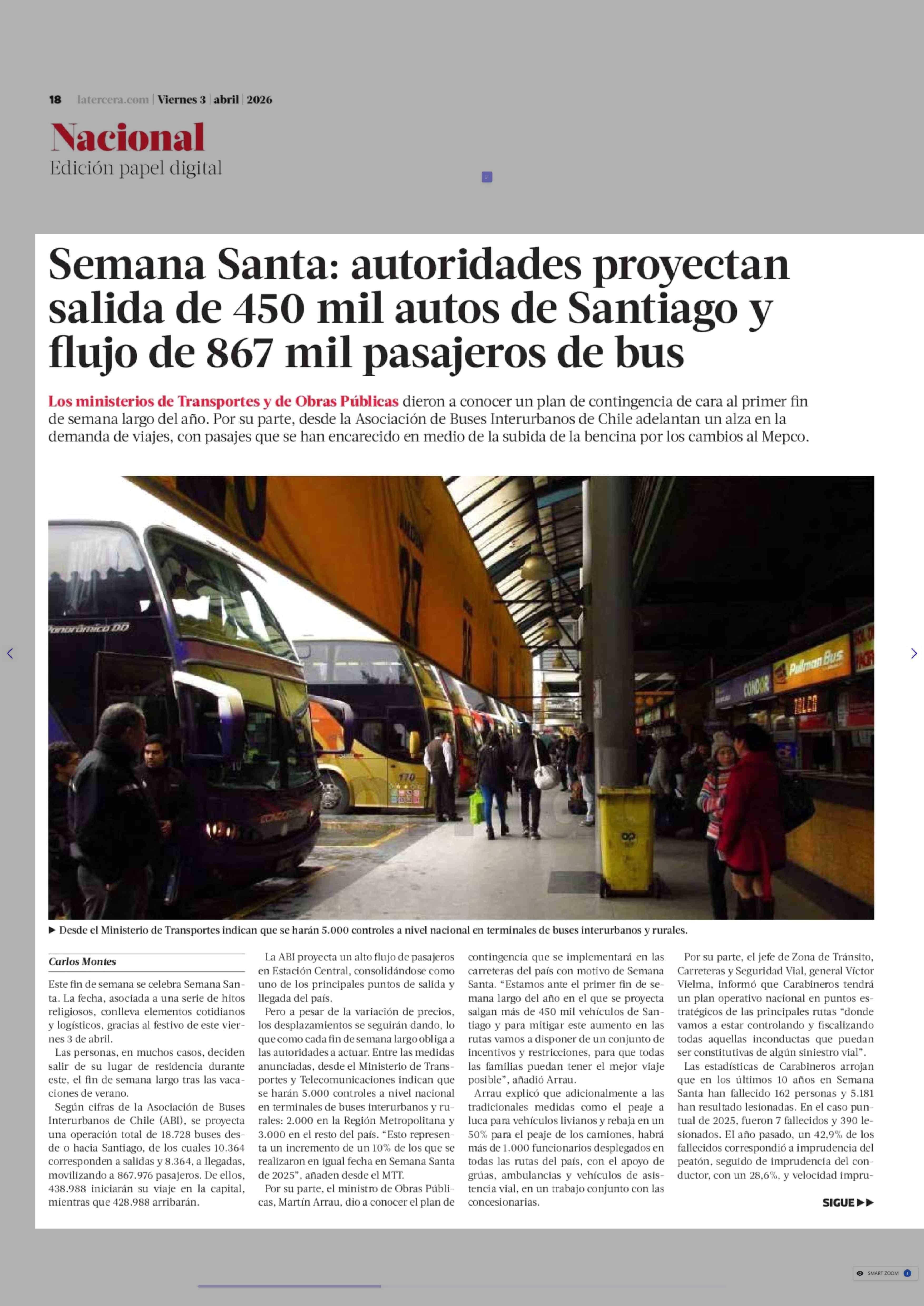 Semana Santa: autoridades proyectan salida de 450 mil autos de Santiago y flujo de 867 mil pasajeros de bus 03-04-2026 La Tercera |