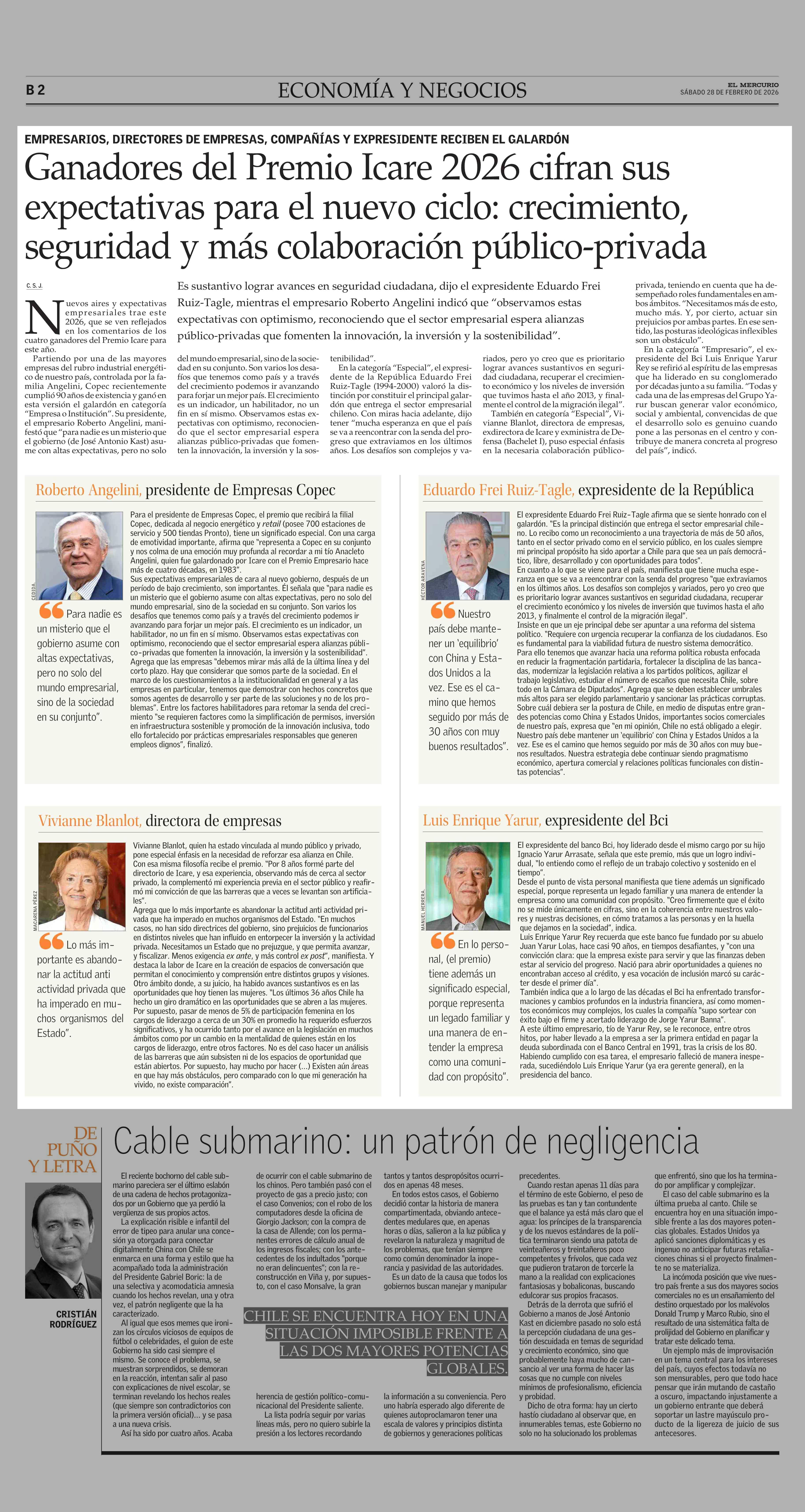 Ganadores del Premio Icare 2026 cifran sus expectativas para el nuevo ciclo: crecimiento, seguridad y más colaboración público-privada 28-02-2026 El Mercurio |