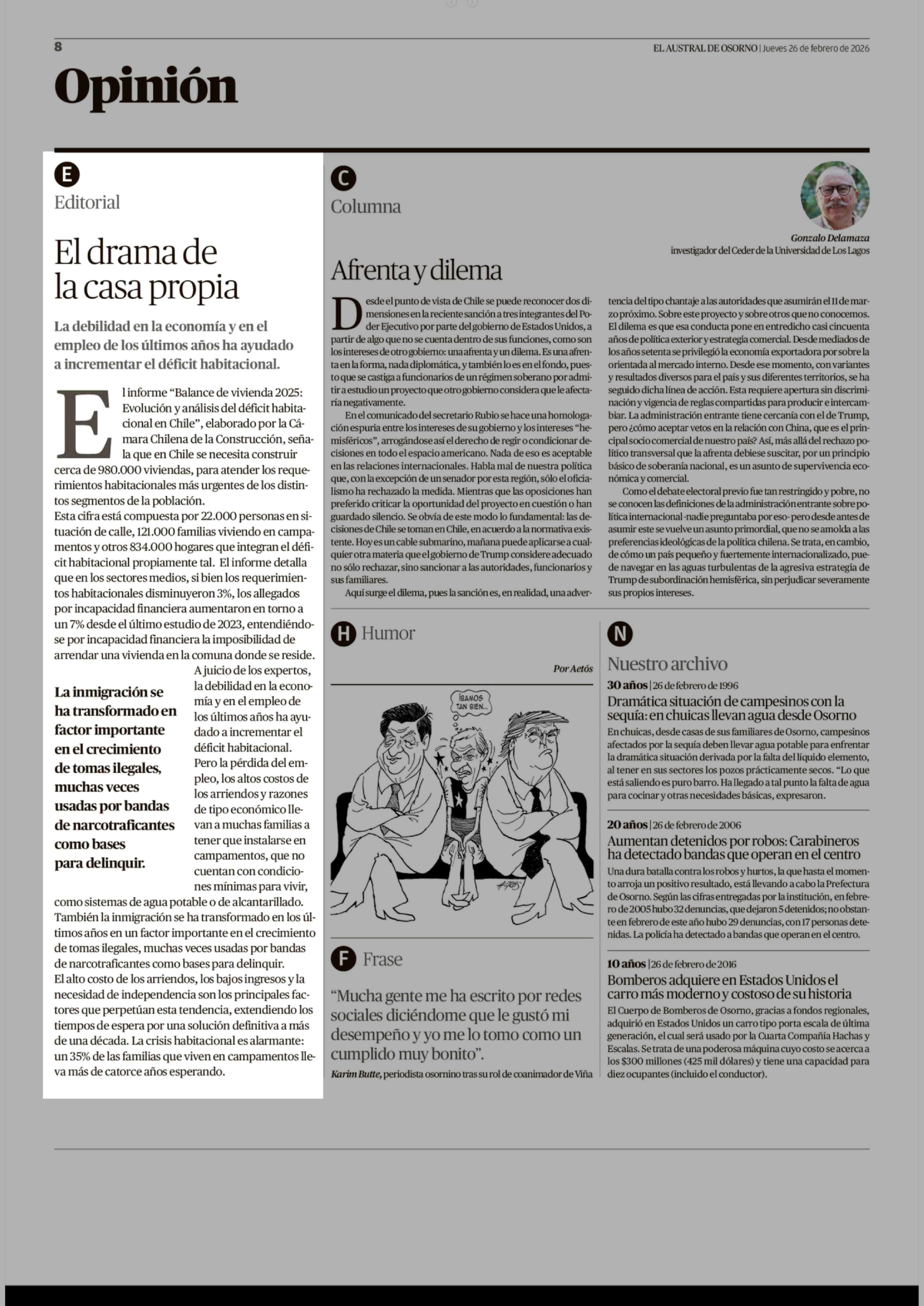 Editorial: El drama de la casa propia 26-02-2026 El Austral de Osorno |