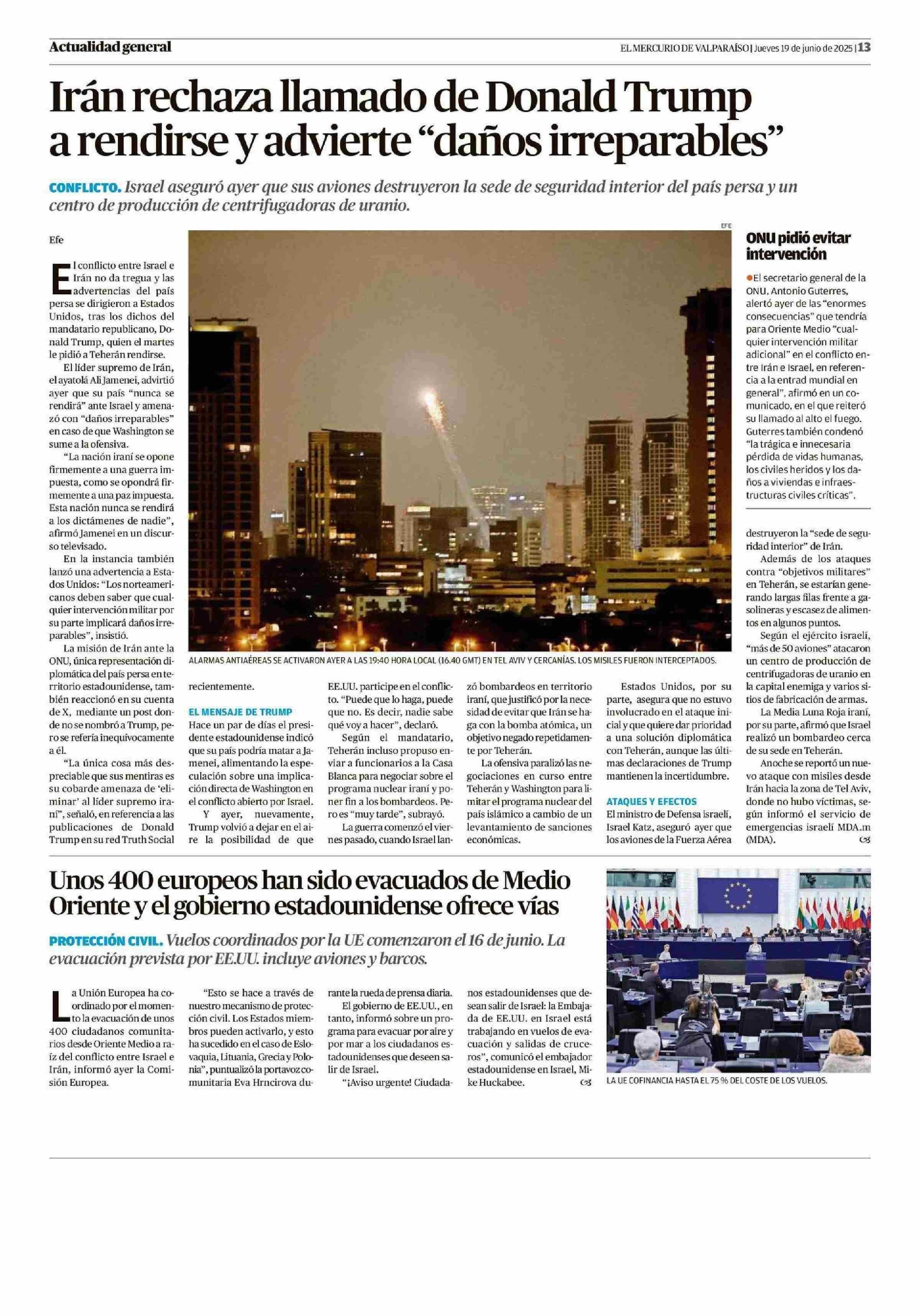 Irán rechaza llamado de Donald Trump a rendirse y advierte "daños irreparables" 19-06-2025 El Mercurio de Valparaíso |