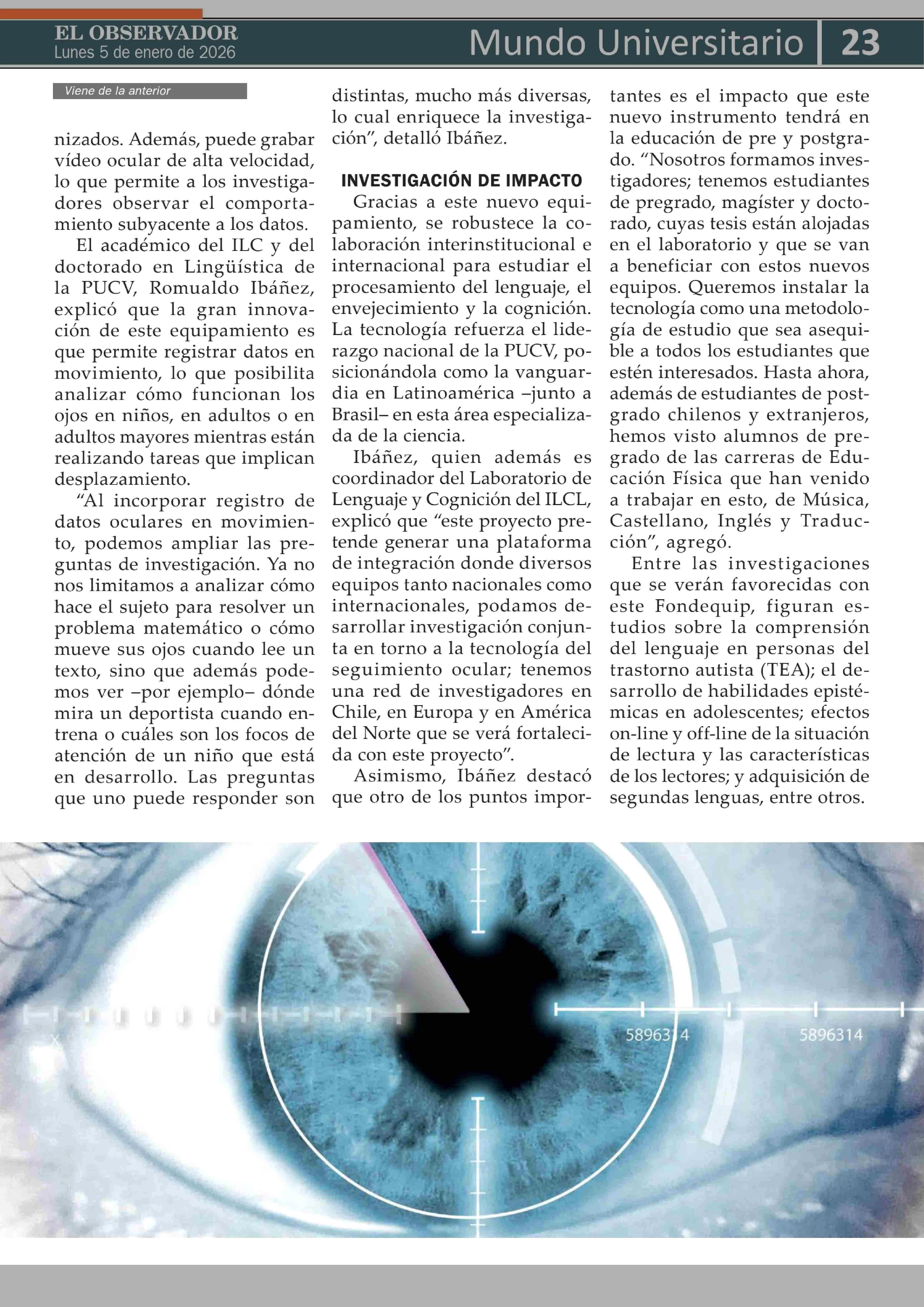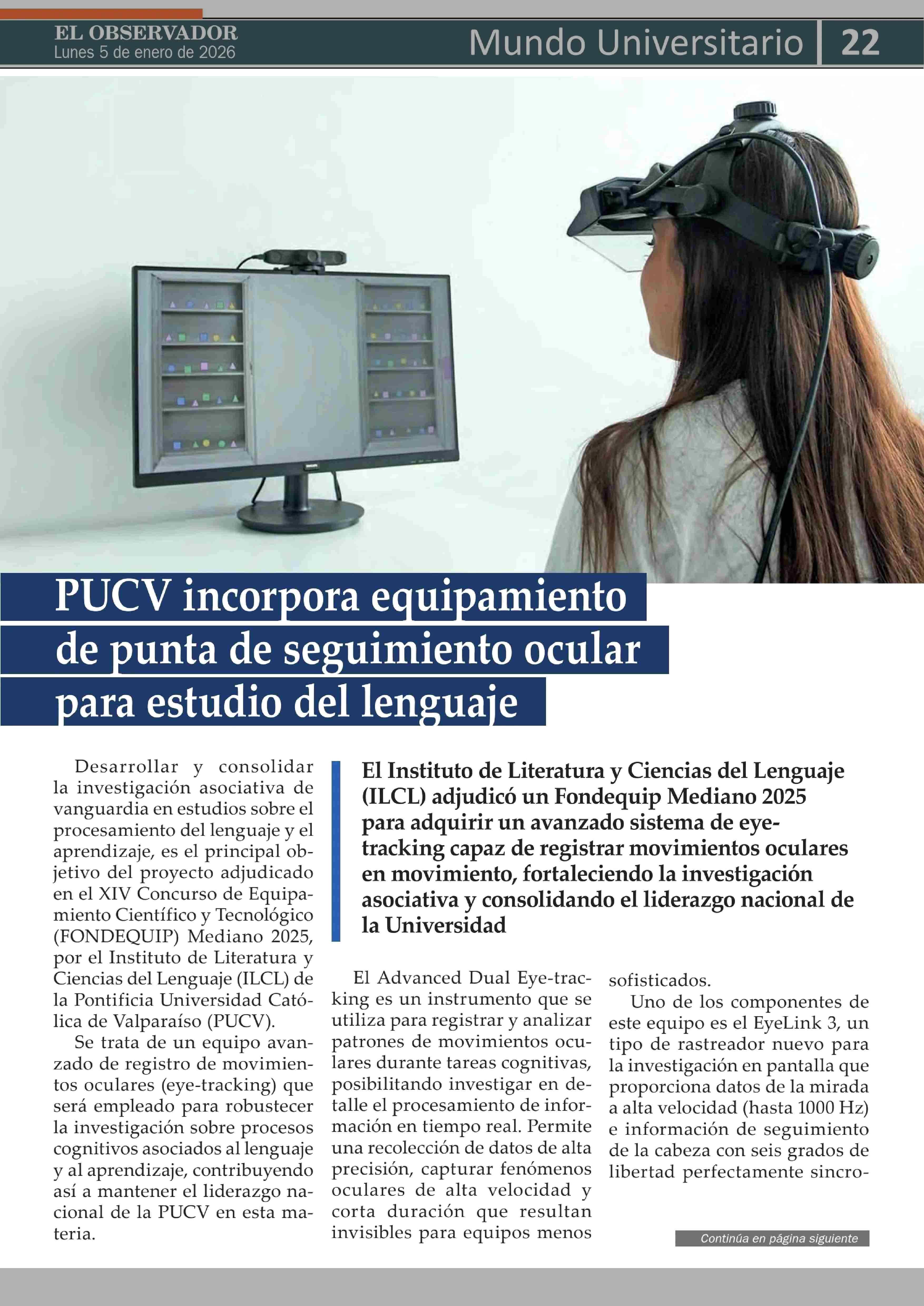 PUCV incorpora equipamiento de punta de seguimiento ocular para estudio del lenguaje 05-01-2026 El Observador Vespertino |