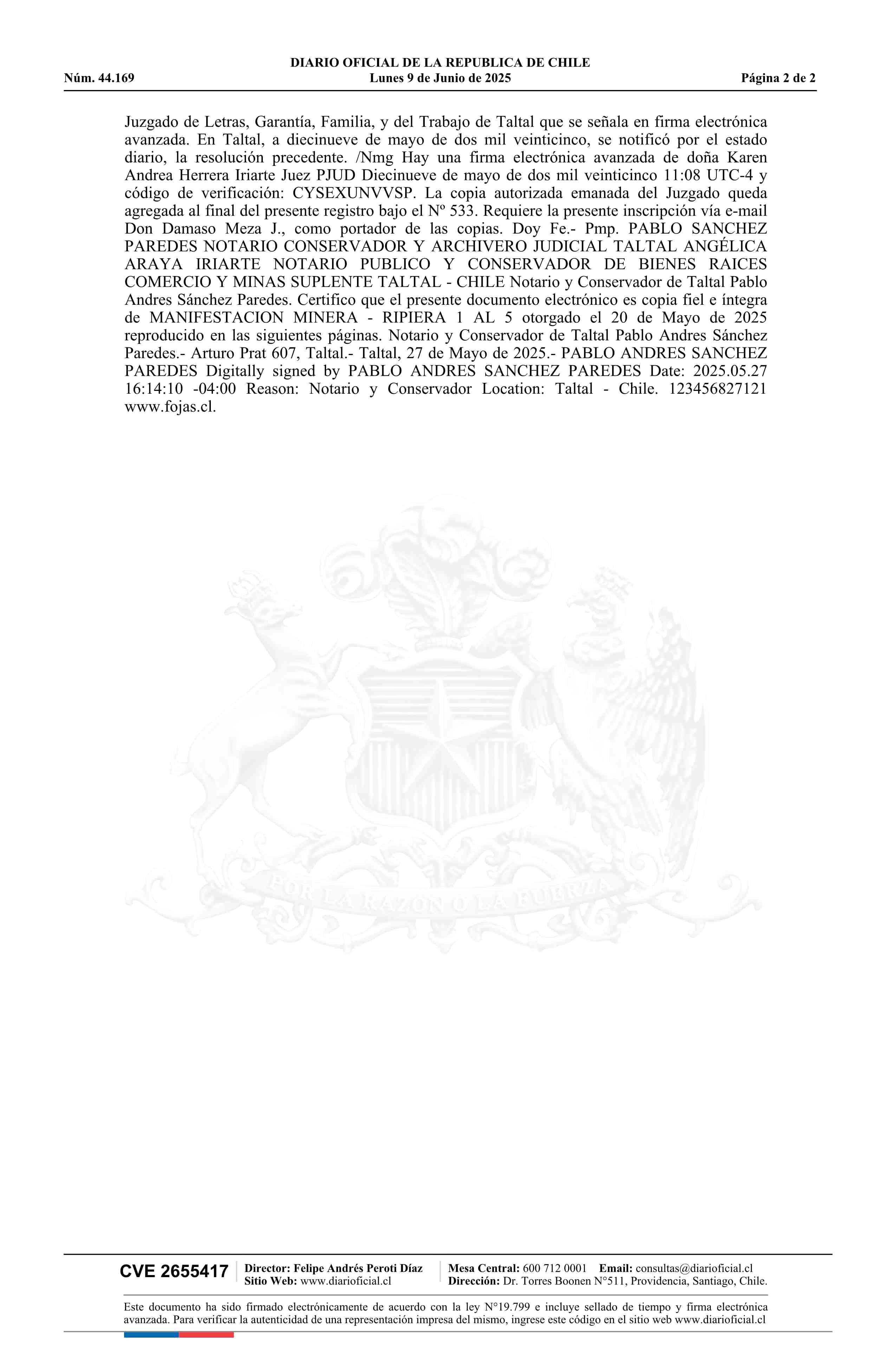 RIPIERA 1 AL 5 / Imax Contratista SpA 09-06-2025 DIARIO OFICIAL CHILE - BOLETÍN OFICIAL DE MINERÍA |