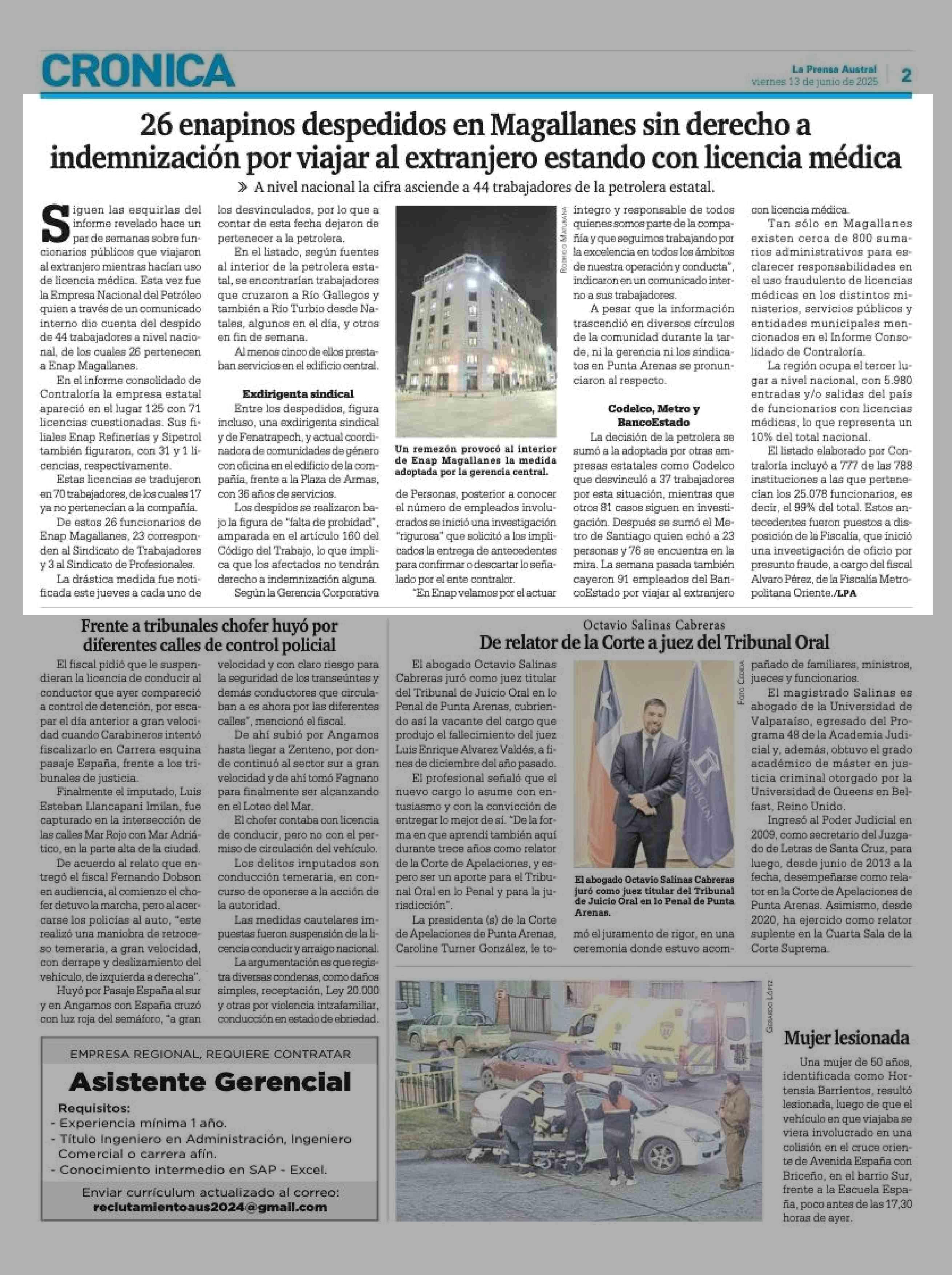 26 Enapinos despedidos en Magallanes sin derecho a indemnización por viajar al extranjero estando con licencia médica 13-06-2025 La Prensa Austral |