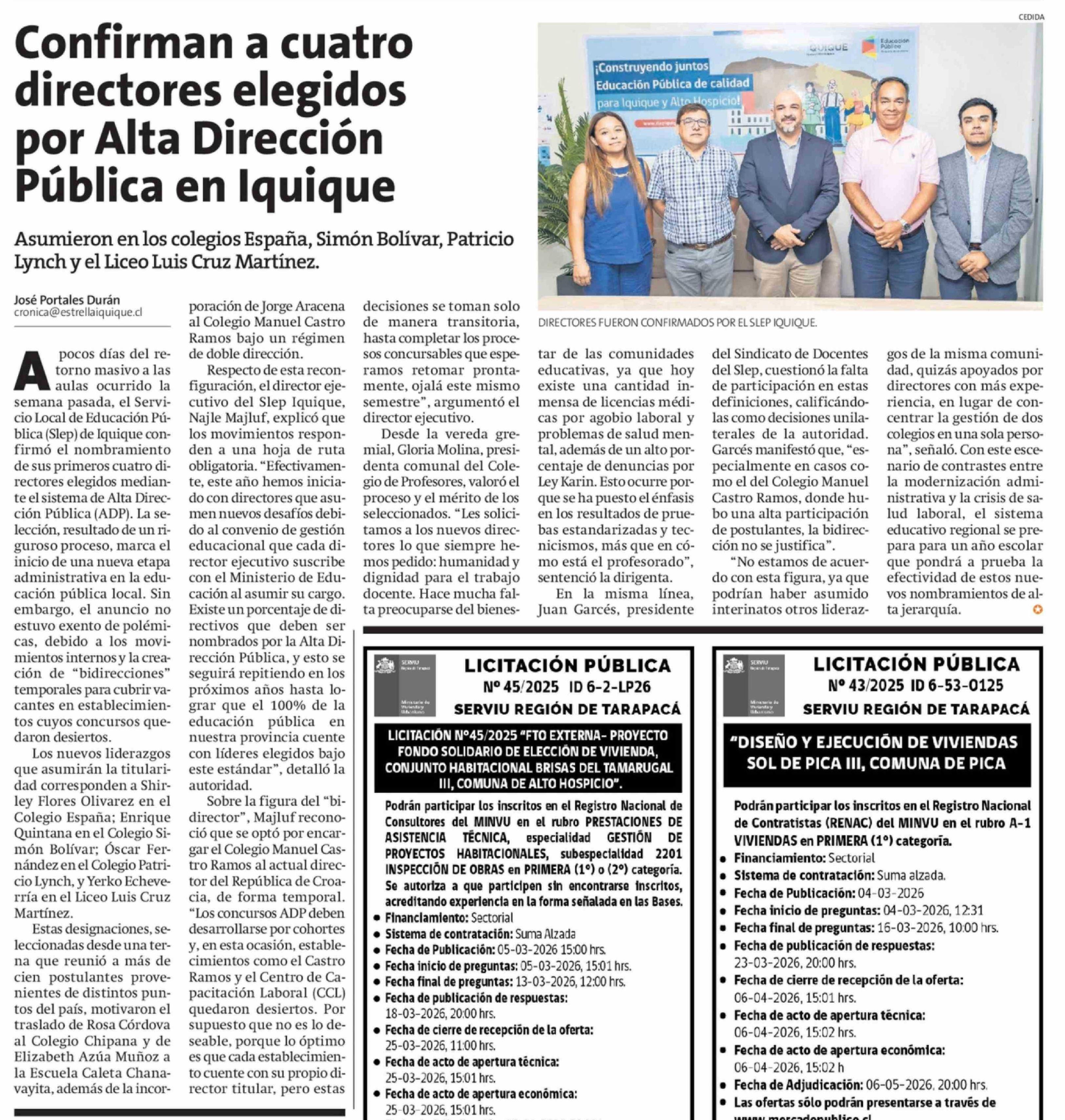 Confirman a cuatro directores elegidos por Alta Dirección Pública en Iquique 10-03-2026 La Estrella de Iquique |