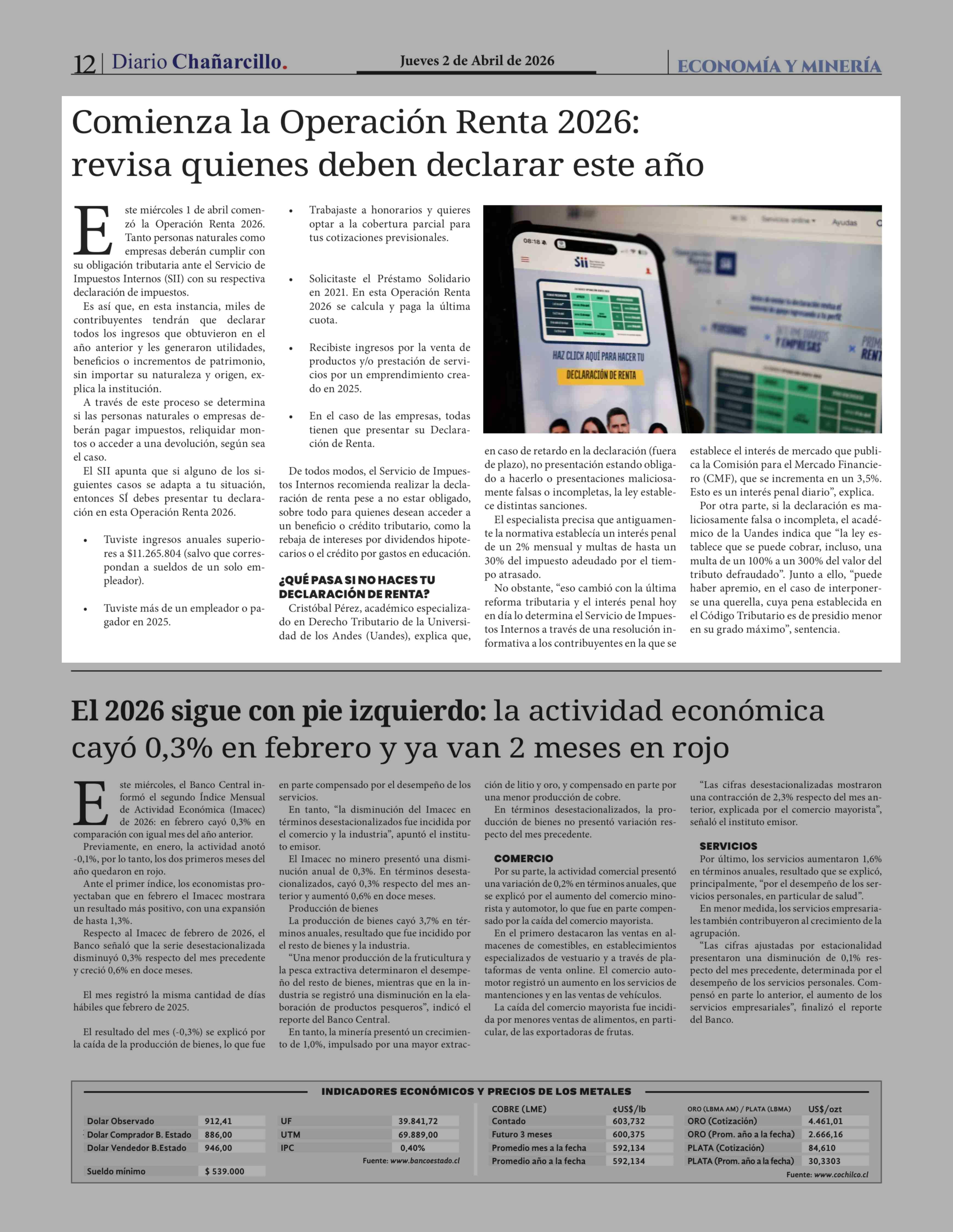 Fuente: Diario Chañarcillo (Diario Chanarcillo) Página(s): 12