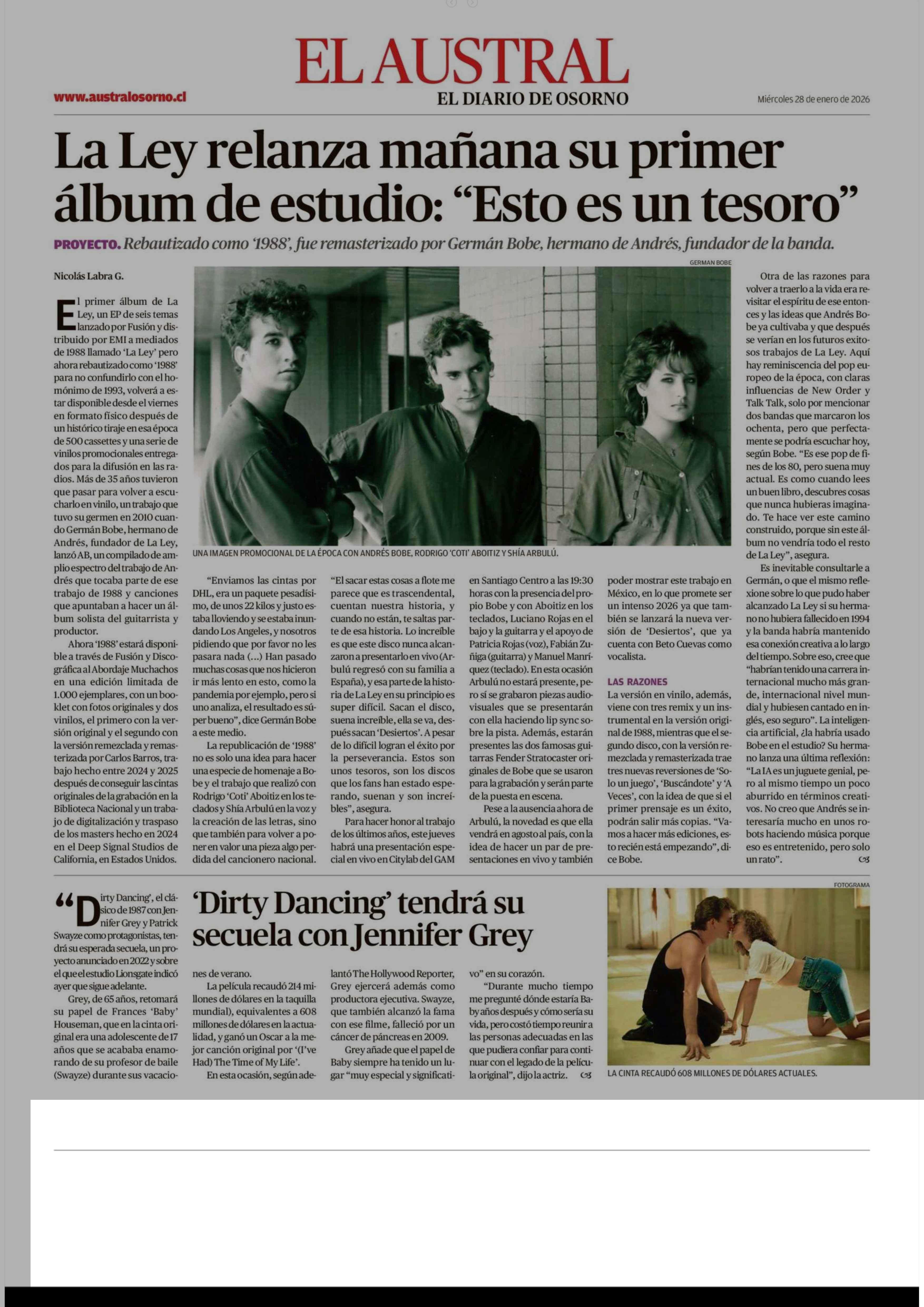 Dirty Dancing' tendrá su secuela con Jennifer Grey 28-01-2026 El Austral de Osorno |