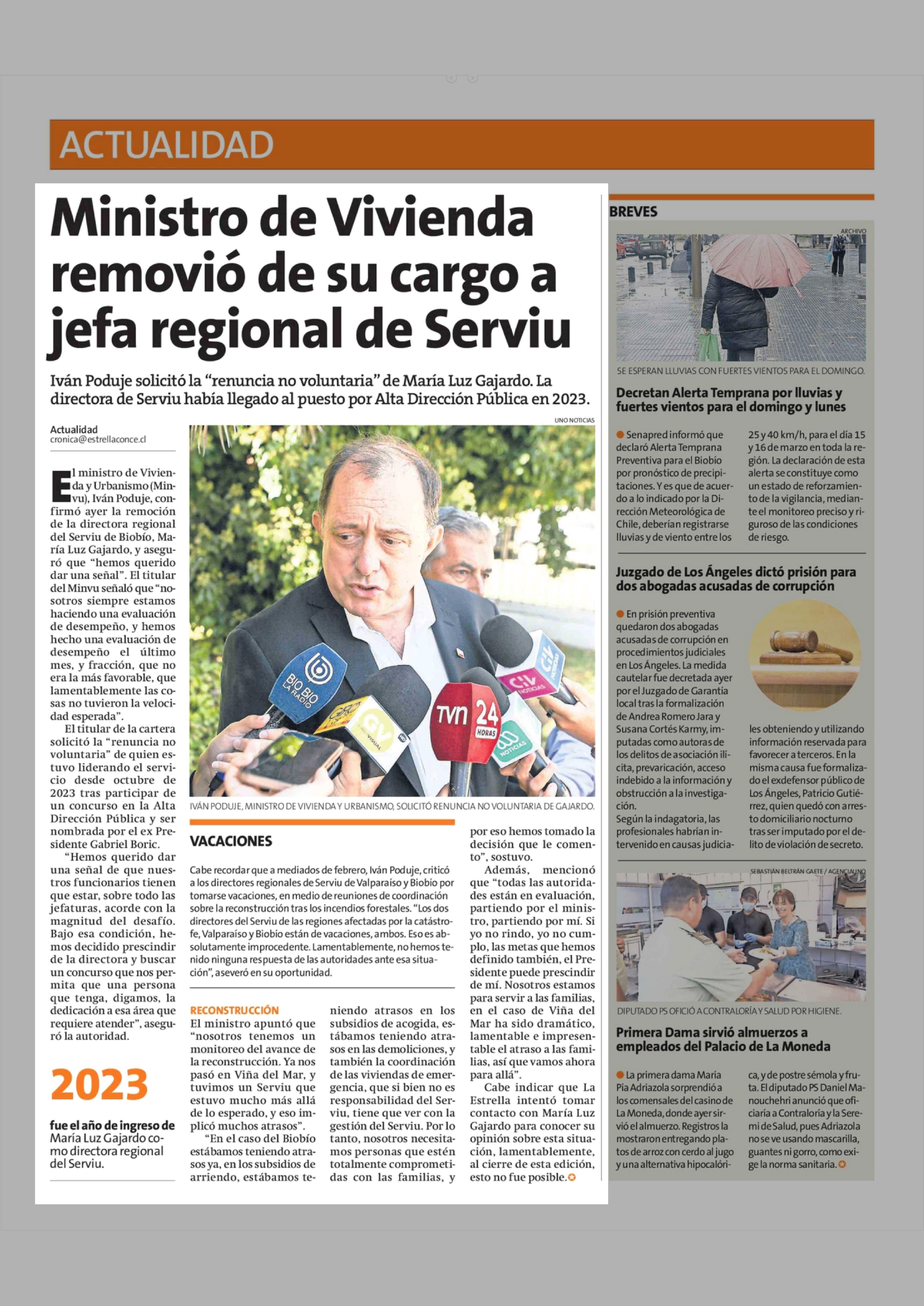 Ministro de Vivienda removió de su cargo a jefa regional de Serviu 13-03-2026 La Estrella de Concepción |
