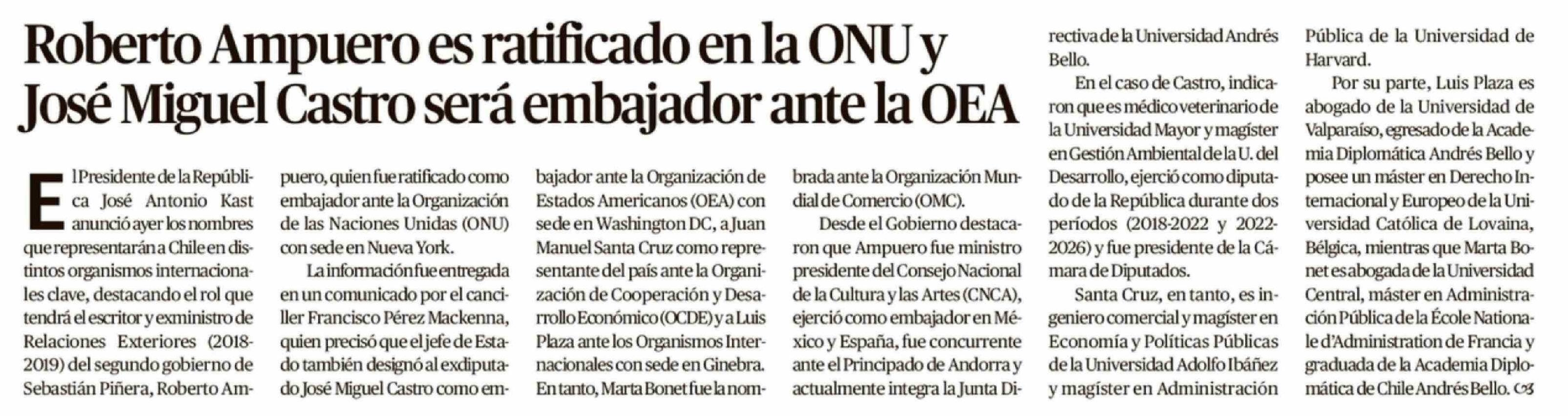 Título: Roberto Ampuero es ratificado en la ONU y José Miguel Castro será embajador ante la OEA