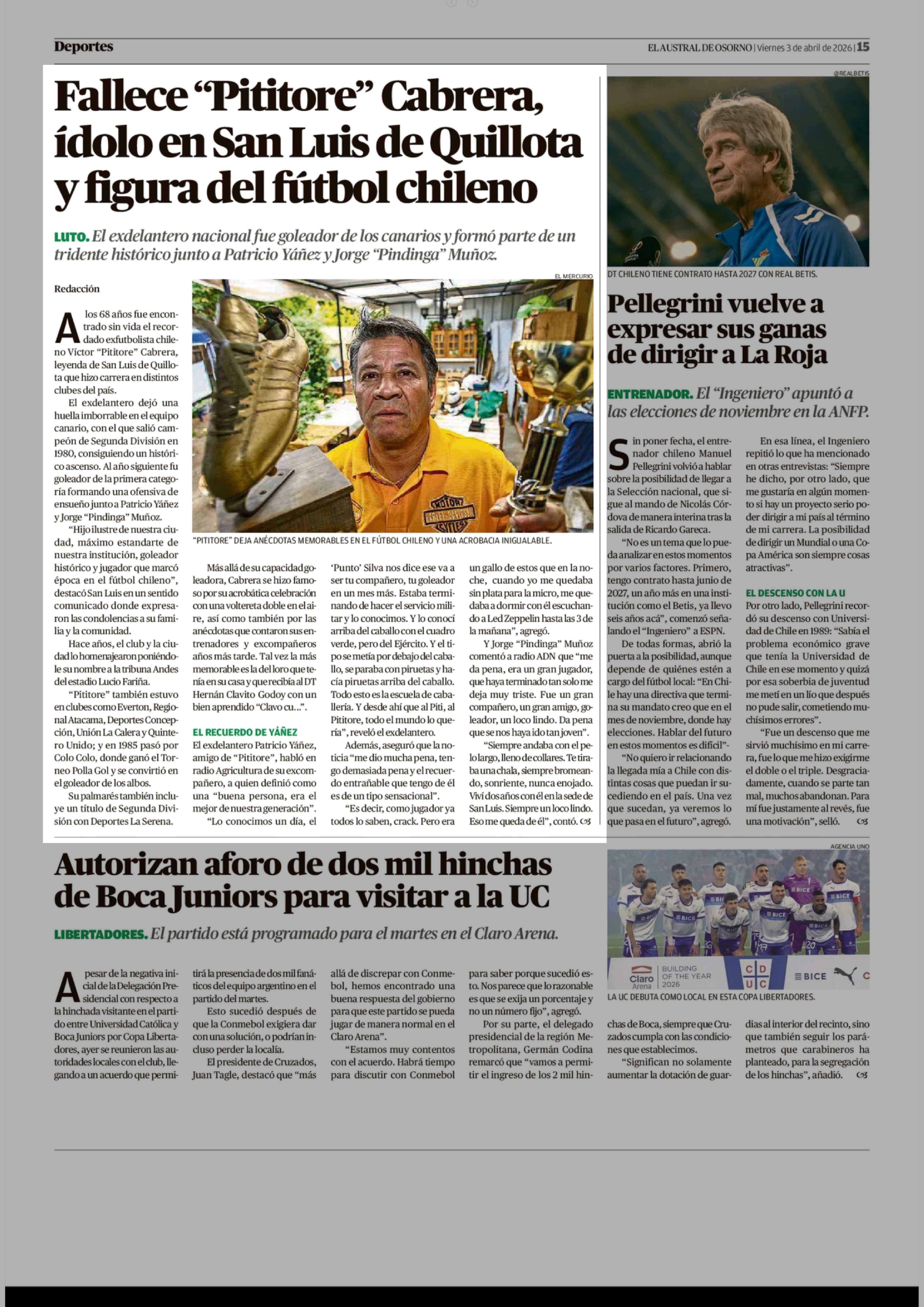Fallece "Pititore" Cabrera, ídolo en San Luis de Quillota y figura del fútbol chileno 03-04-2026 El Austral de Osorno |
