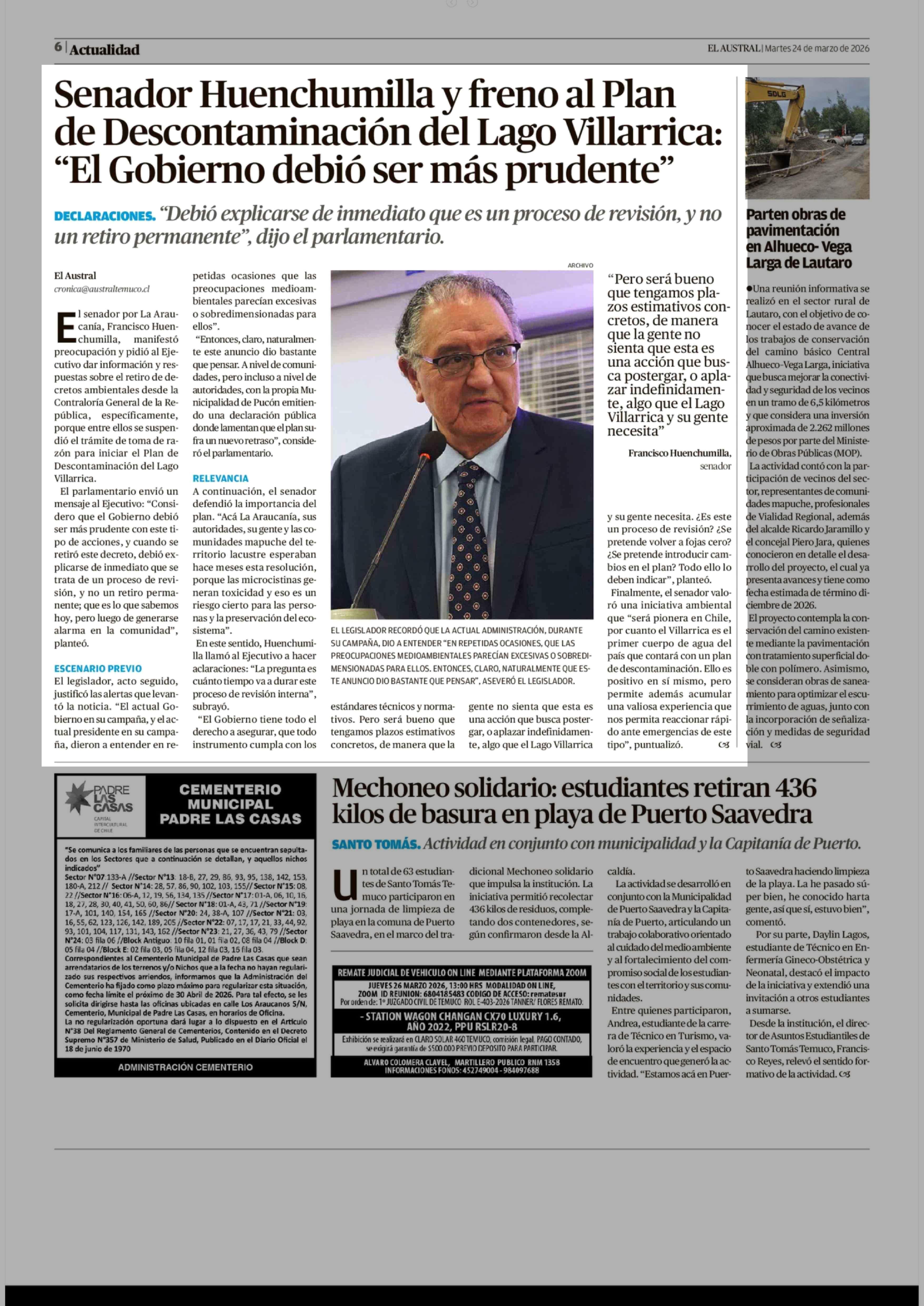 Senador Huenchumilla y freno al Plan de Descontaminación del Lago Villarrica: "El Gobierno debió ser más prudente" 24-03-2026 El Austral de la Araucanía |