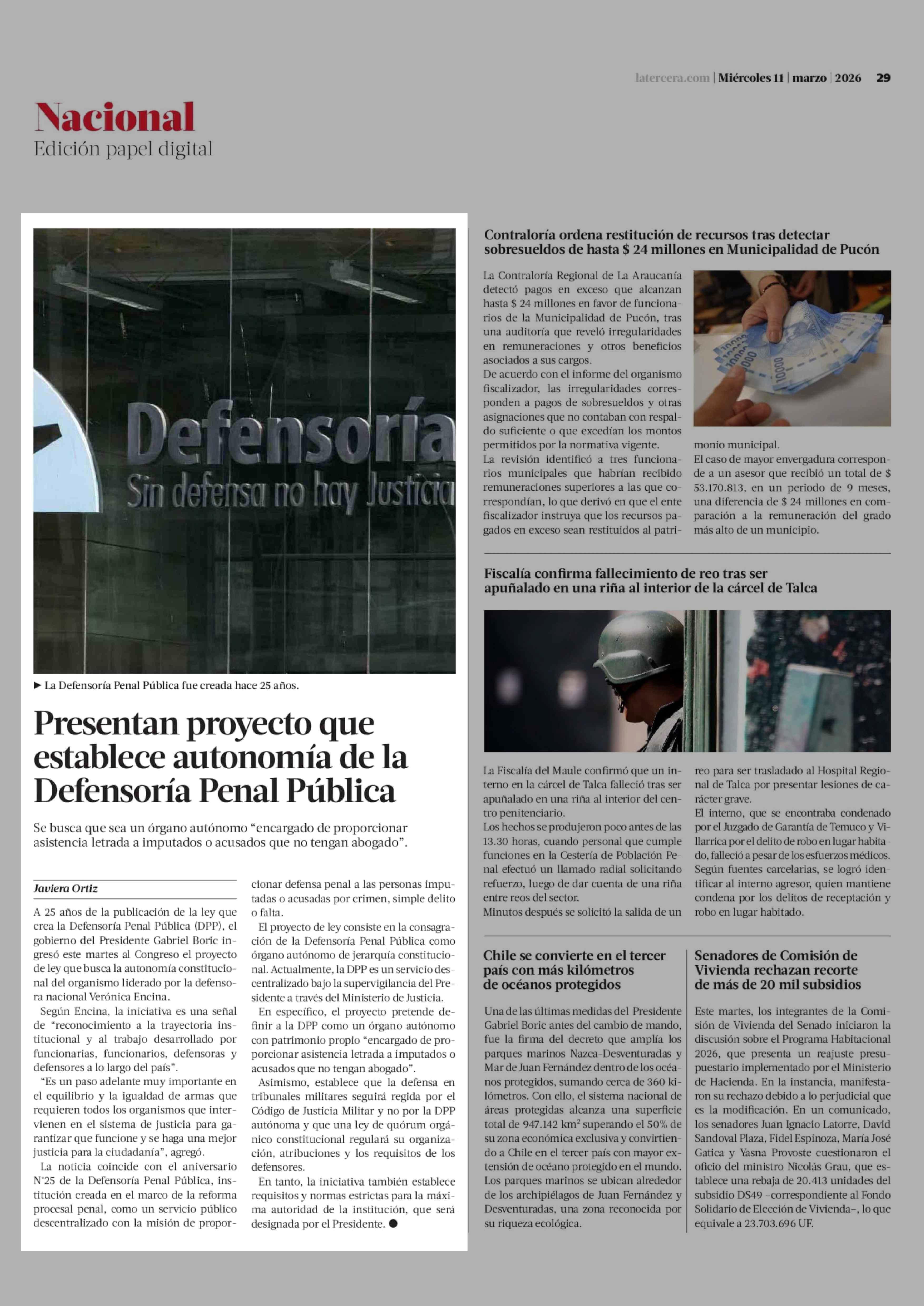Presentan proyecto que establece autonomía de la Defensoría Penal Pública 11-03-2026 La Tercera |