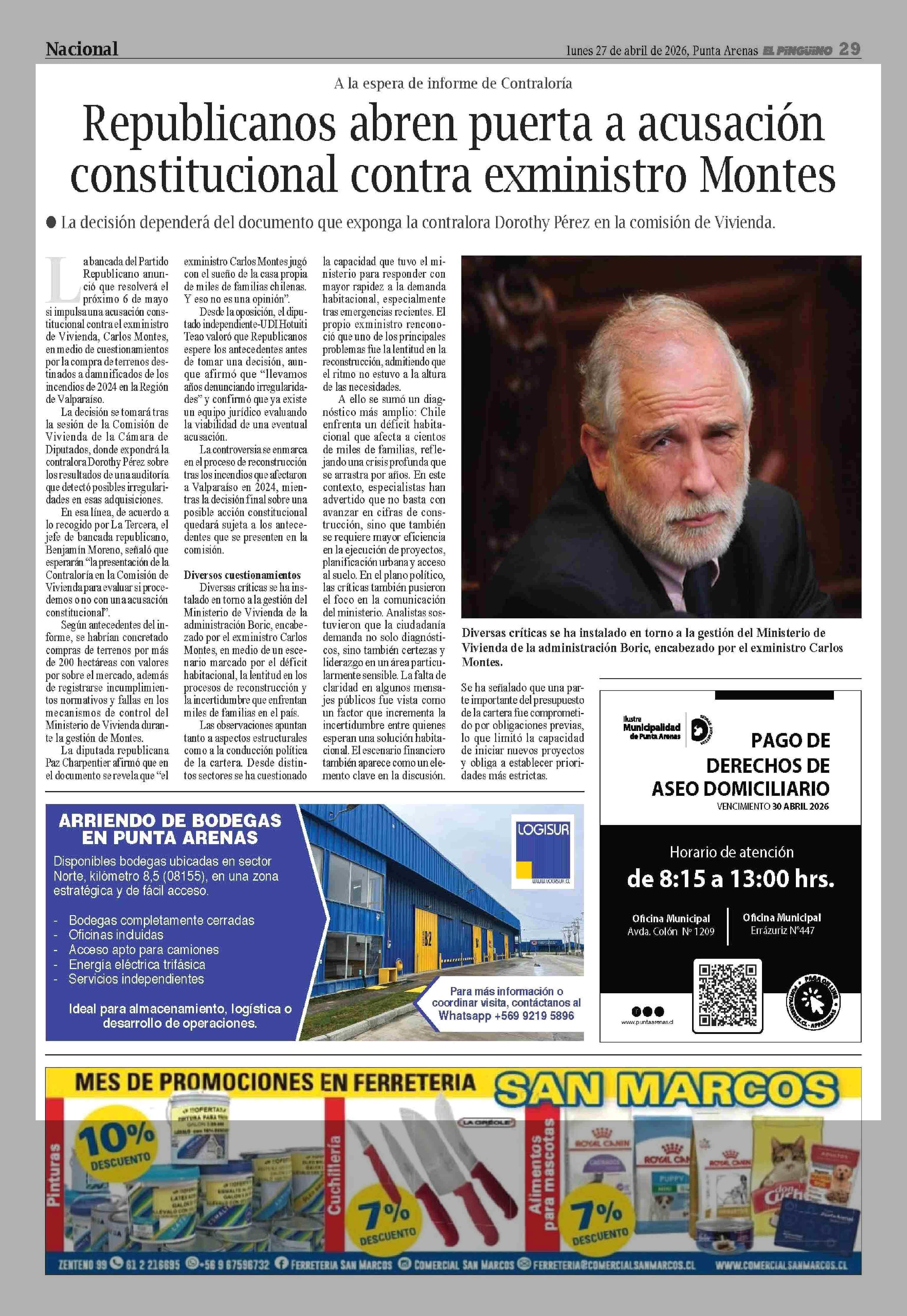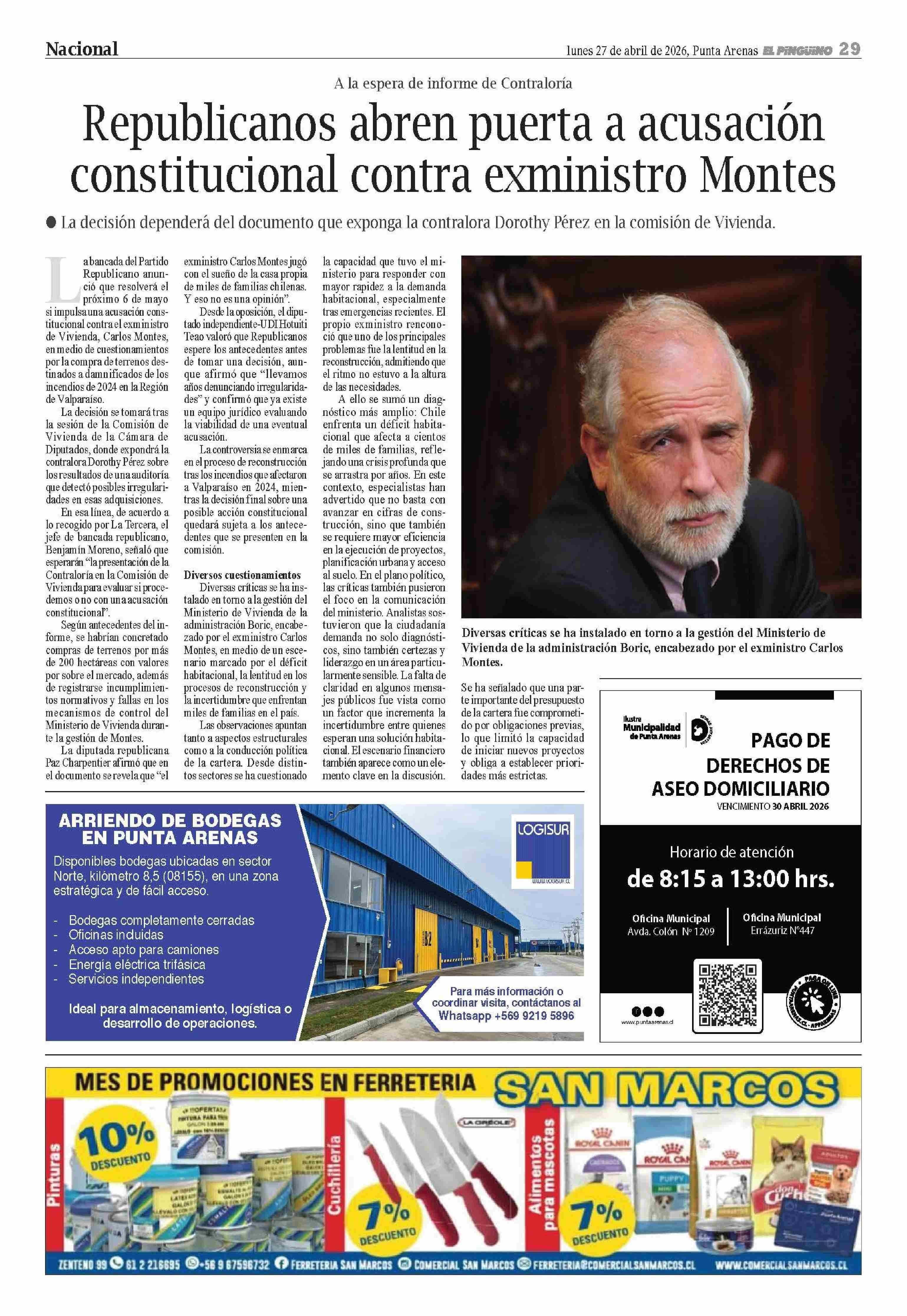 Republicanos abren puerta a acusación constitucional contra exministro Montes 27-04-2026 El Pingüino |
