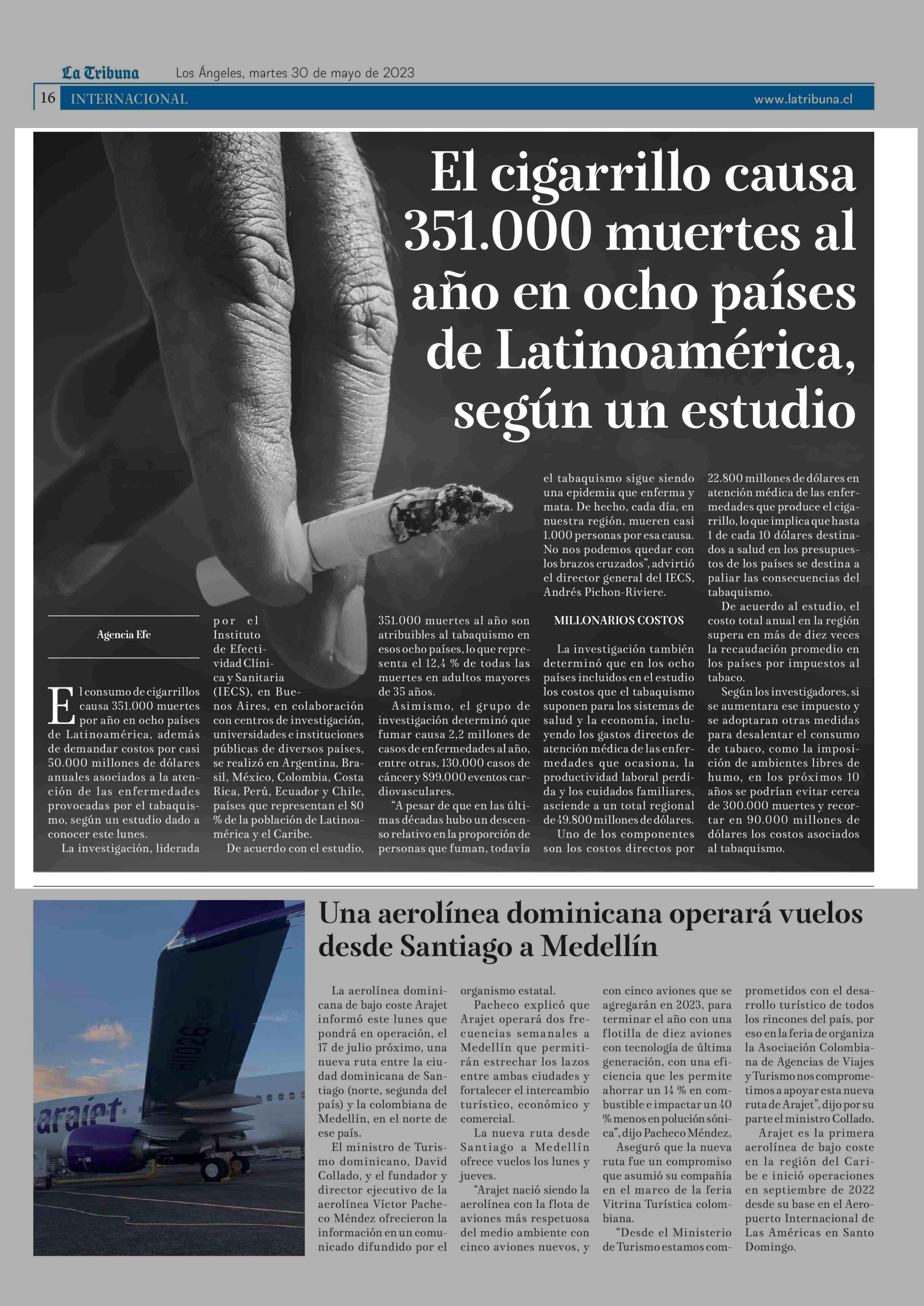 El cigarrillo causa 351.000 muertes al año en ocho países de Latinoamérica, según un estudio 30-05-2023 La Tribuna |