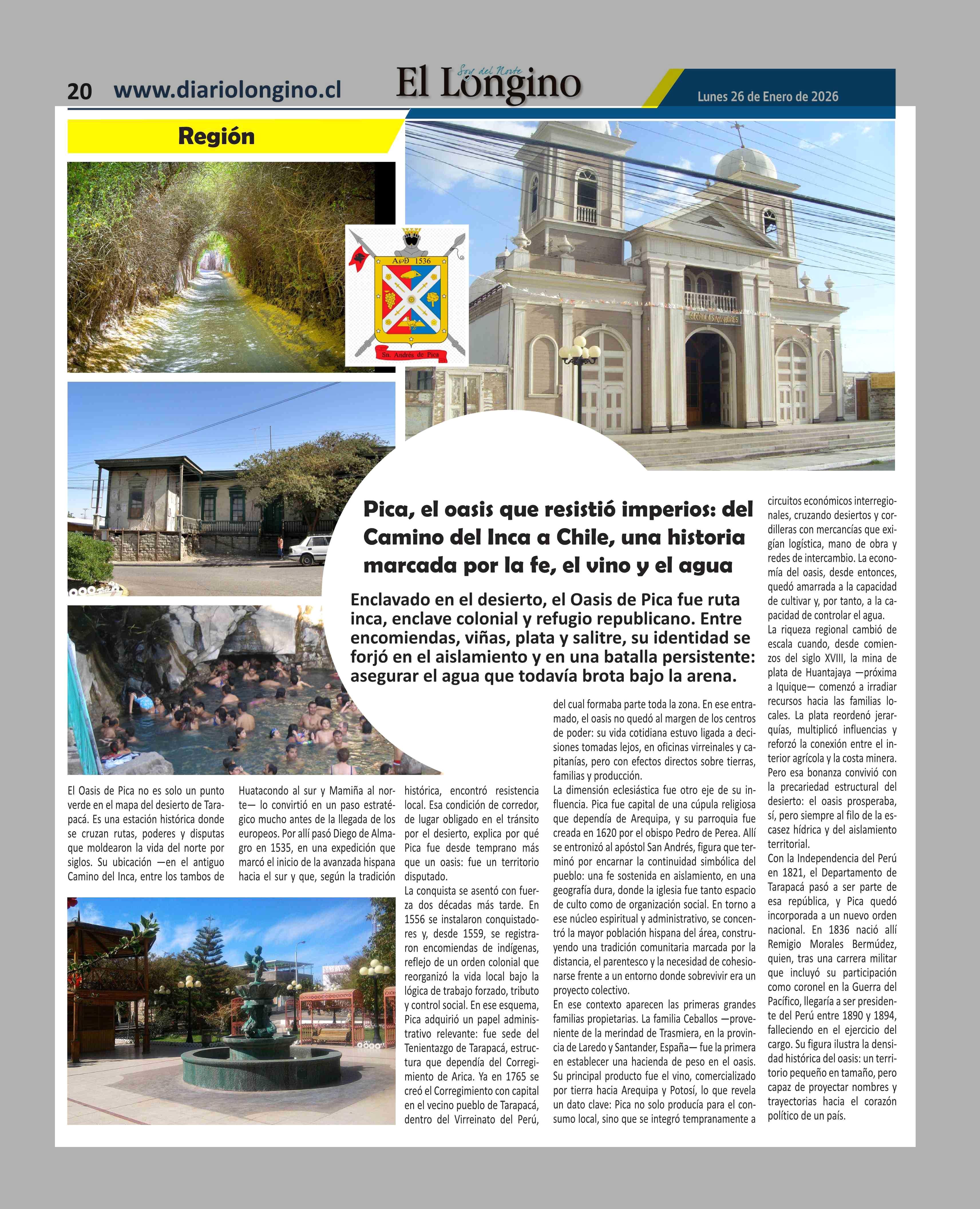 Pica, el oasis que resistió imperios: del Camino del Inca a Chile, una historia marcada por la fe, el vino y el agua 26-01-2026 El Longino |