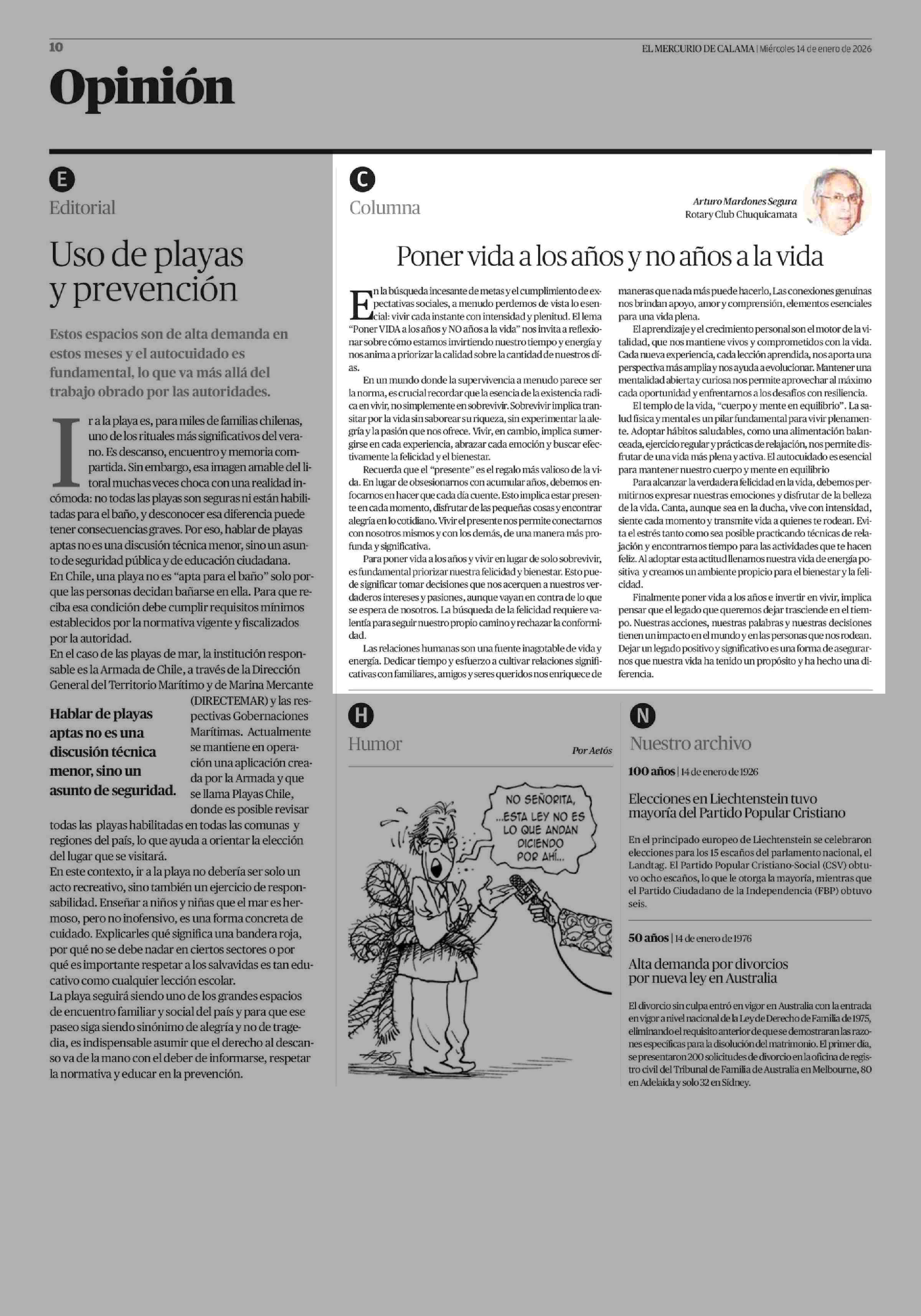 Columnas de Opinión: Poner vida a los años y no años a la vida 14-01-2026 El Mercurio de Calama |