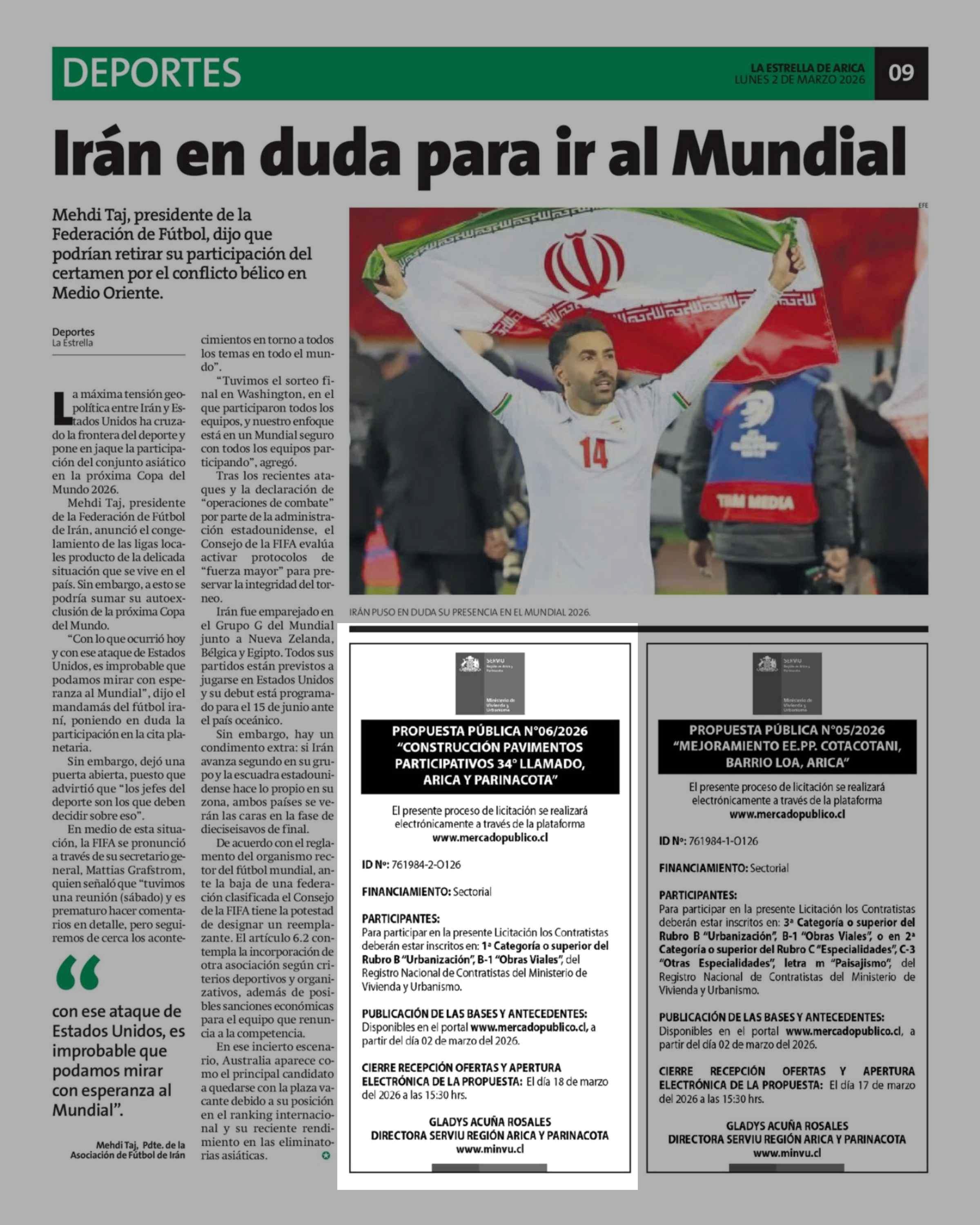 Aviso Licitaciones: PROPUESTA PUBLICA Nº06/2026 "CONSTRUCCIÓN PAVIMENTOS PARTICIPATIVOS 34° LLAMADO, ARICA Y PARINACOTA" 02-03-2026 La Estrella de Arica |
