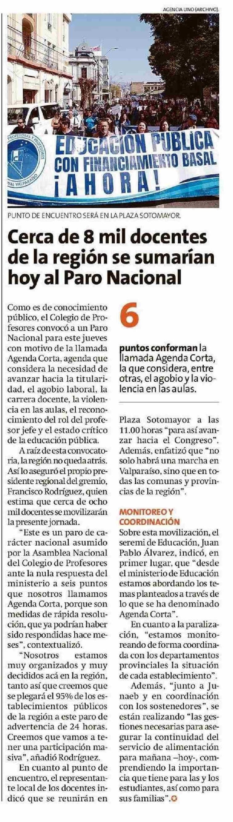 Cerca de 8 mil docentes de la región se sumarían hoy al Paro Nacional 15-05-2025 La Estrella de Valparaíso |