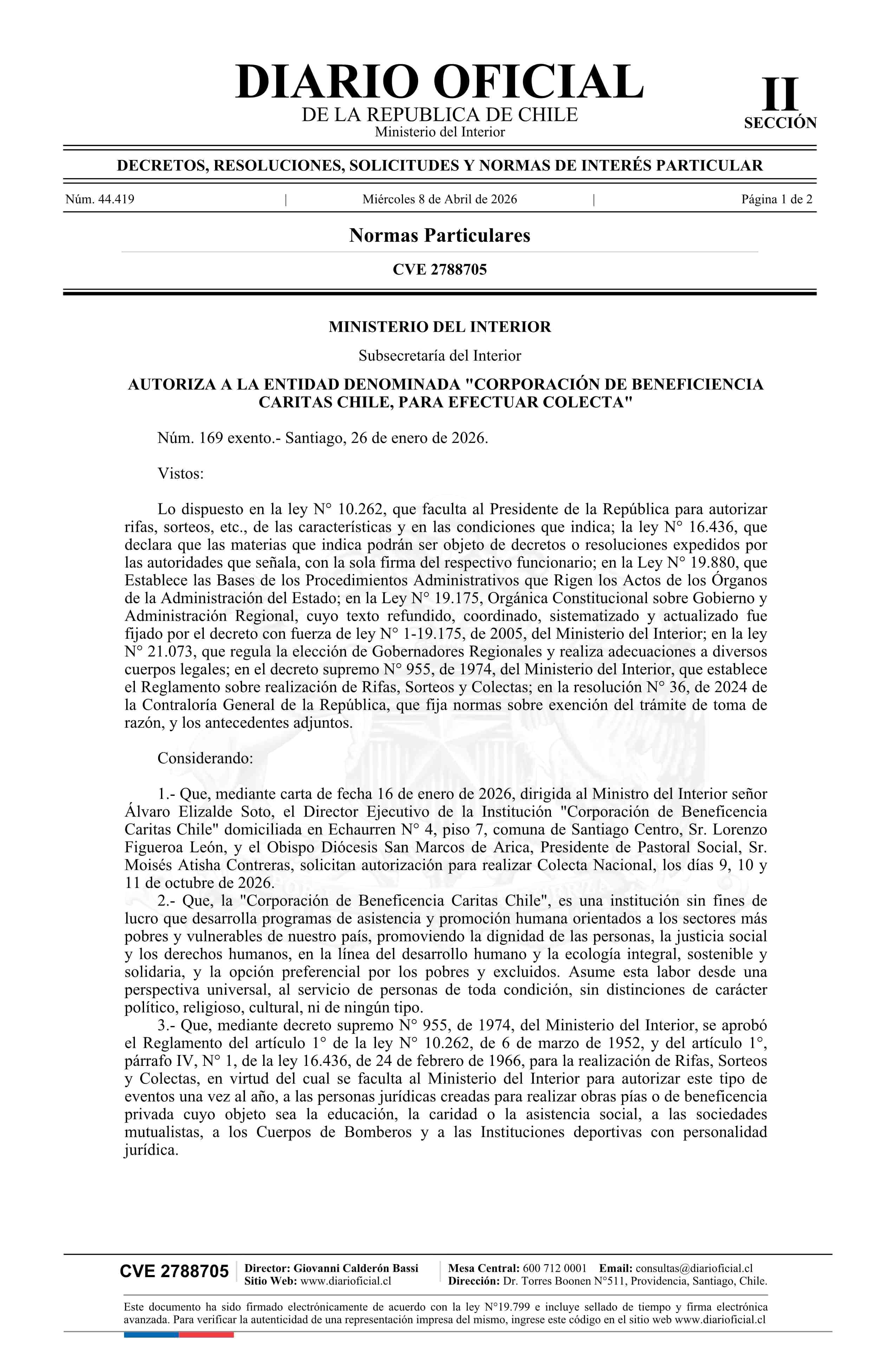 Decreto exento número 169, de 2026.- Autoriza a la entidad denominada Corporación de Beneficiencia Caritas Chile, para efectuar colecta 08-04-2026 Diario Oficial Edición Electrónica |