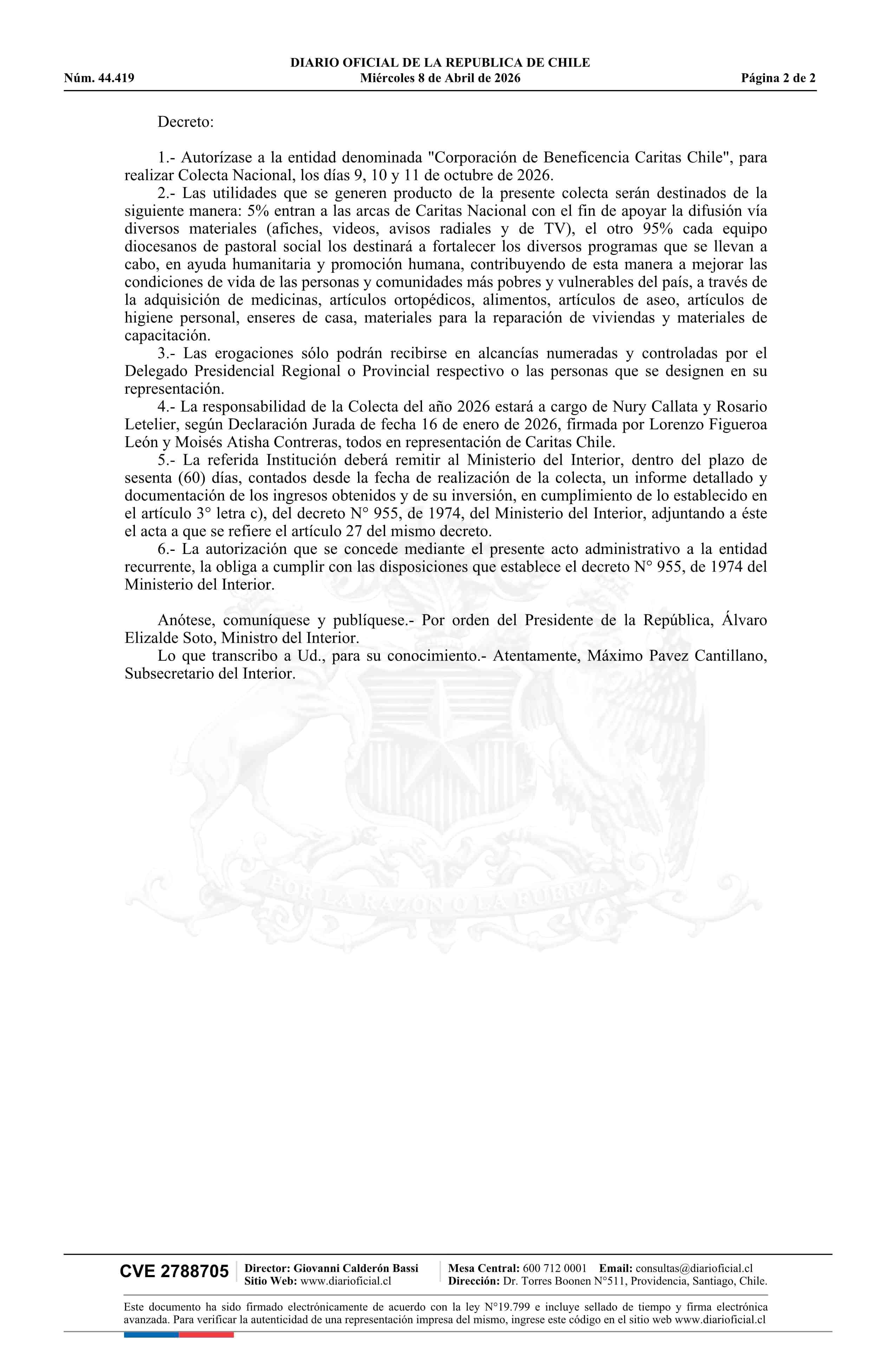 | Título: | Decreto exento número 169, de 2026.- Autoriza a la entidad denominada Corporación de Beneficiencia Caritas Chile, para efectuar colecta |
