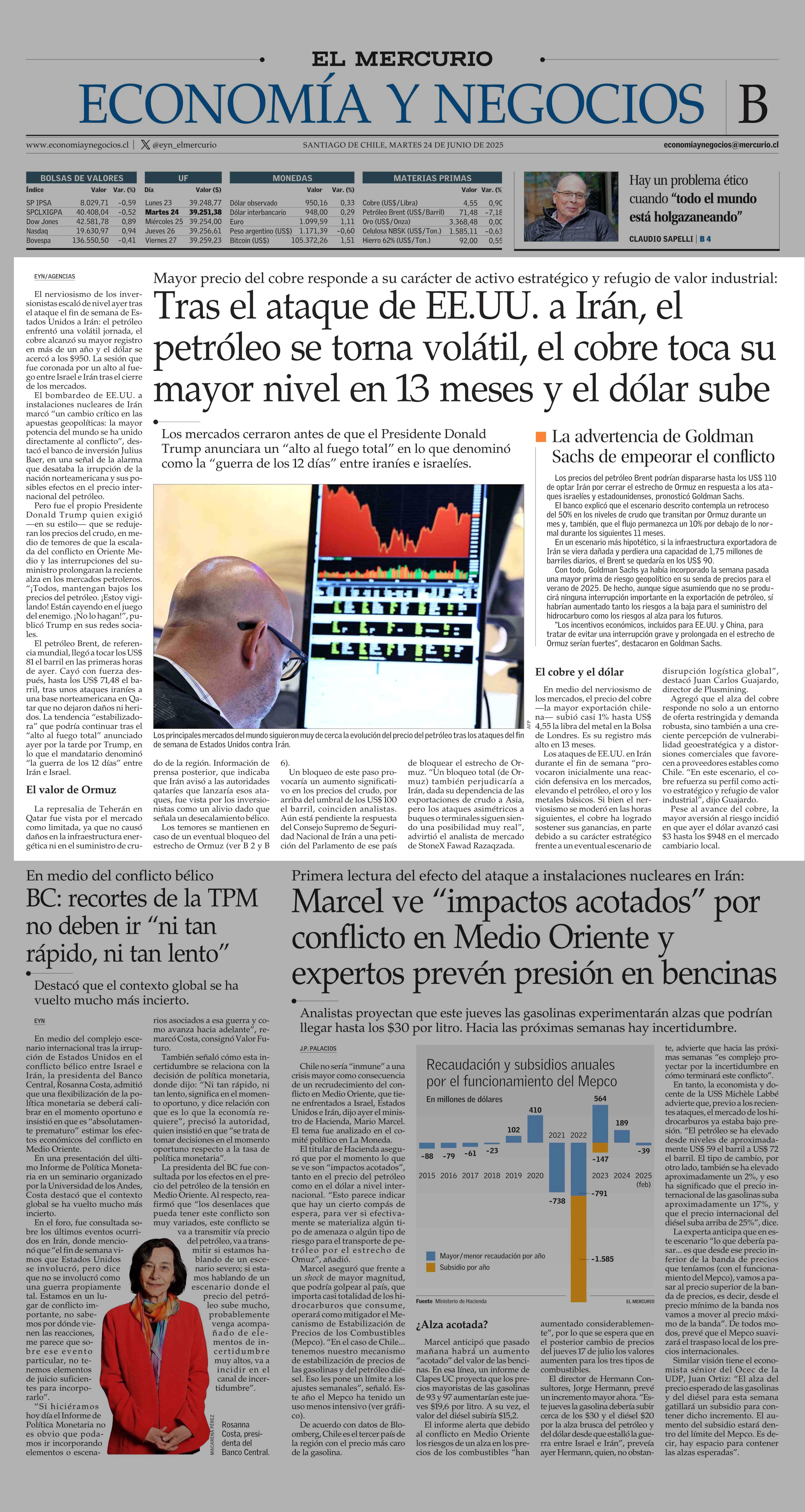 Tras el ataque de EE.UU. a Irán, el petróleo se torna volátil, el cobre toca su mayor nivel en 13 meses y el dólar sube 24-06-2025 El Mercurio |