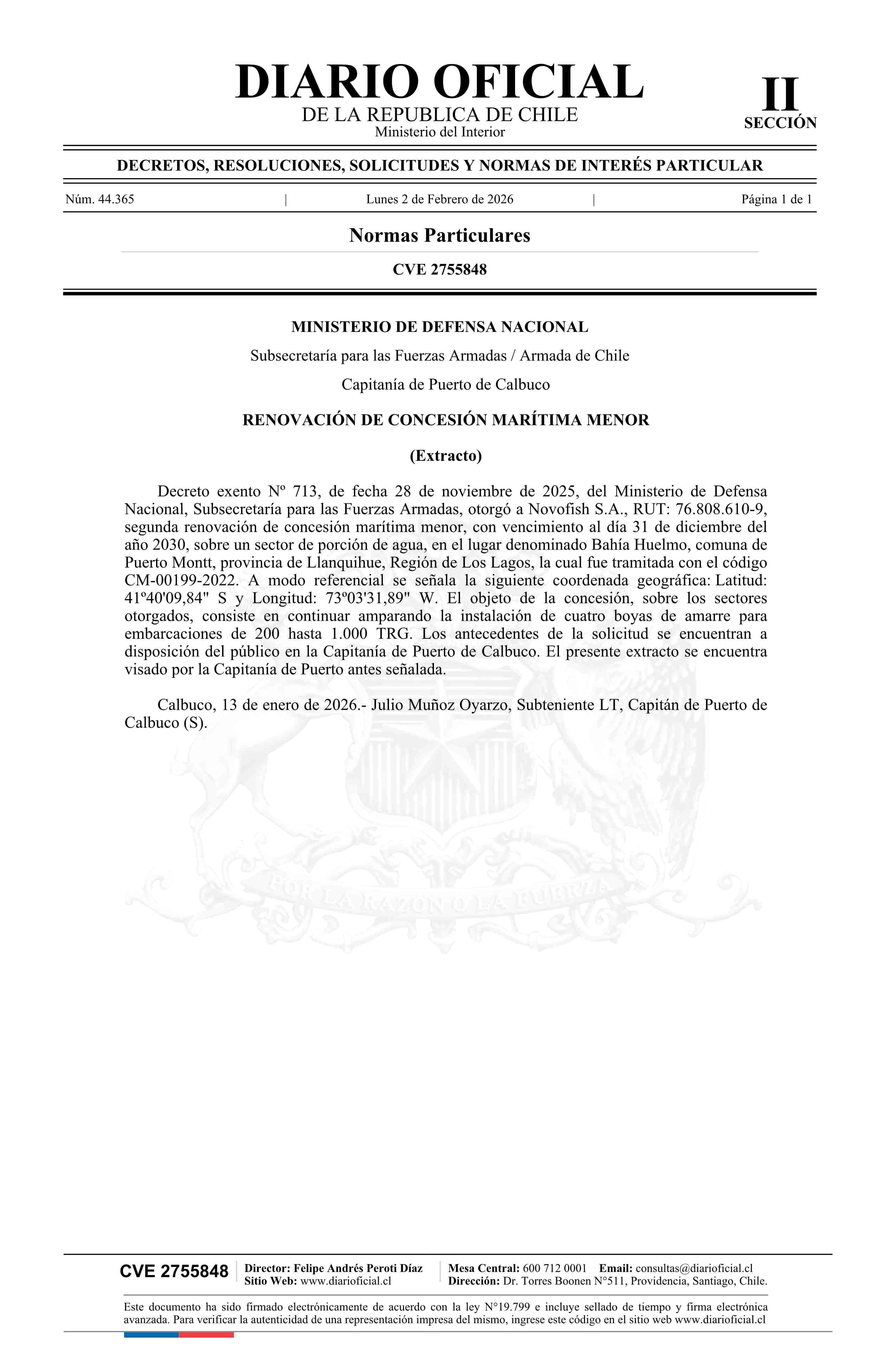 Extracto de decreto exento número 713, de 2025.- Renovación de concesión marítima menor 02-02-2026 Diario Oficial Edición Electrónica |