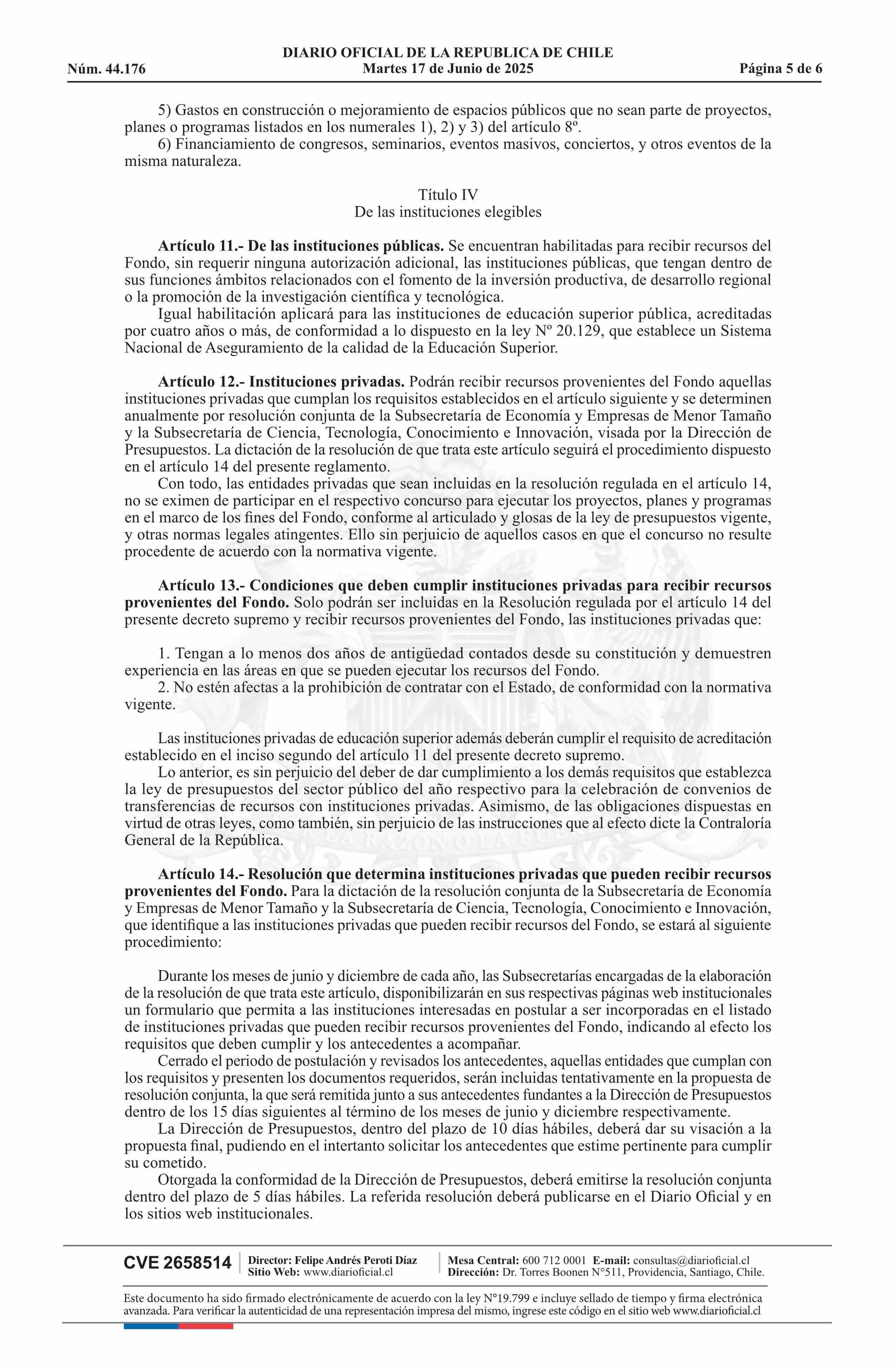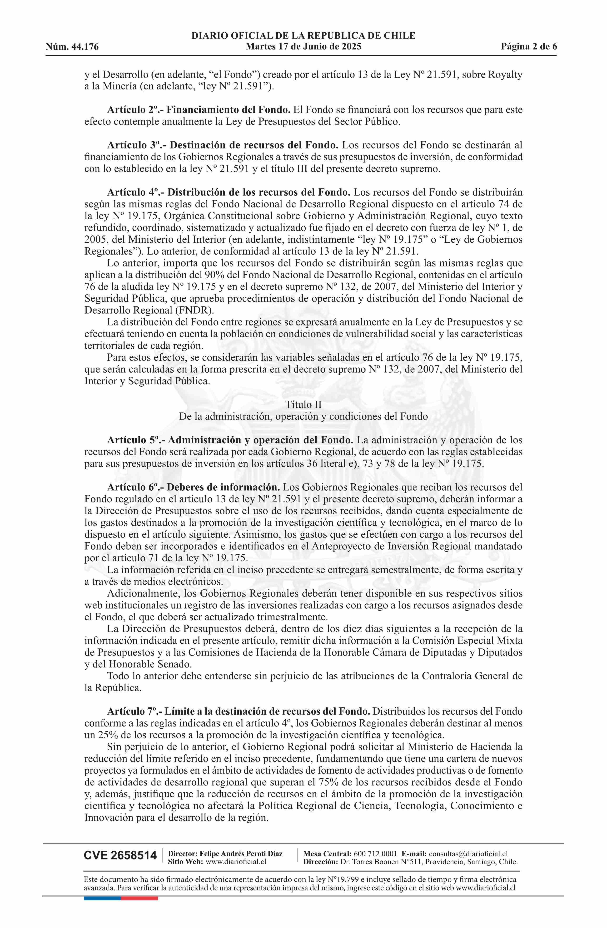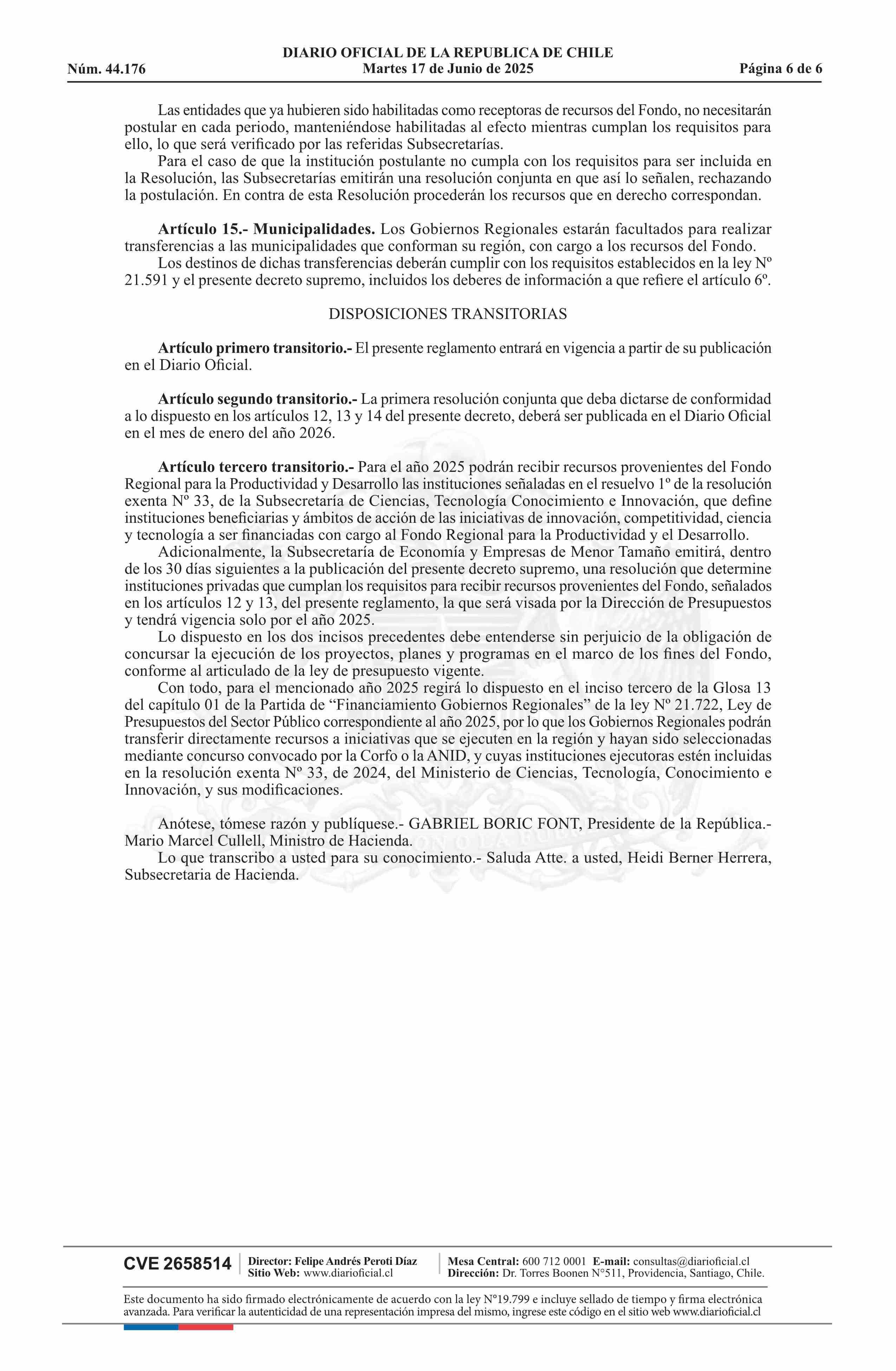 | Título: | Decreto número 1.699, de 2024.- Aprueba decreto supremo que regula la administración, operación, condiciones, destino y distribución de recursos del Fondo Regional para la Productividad y el Desarrollo |