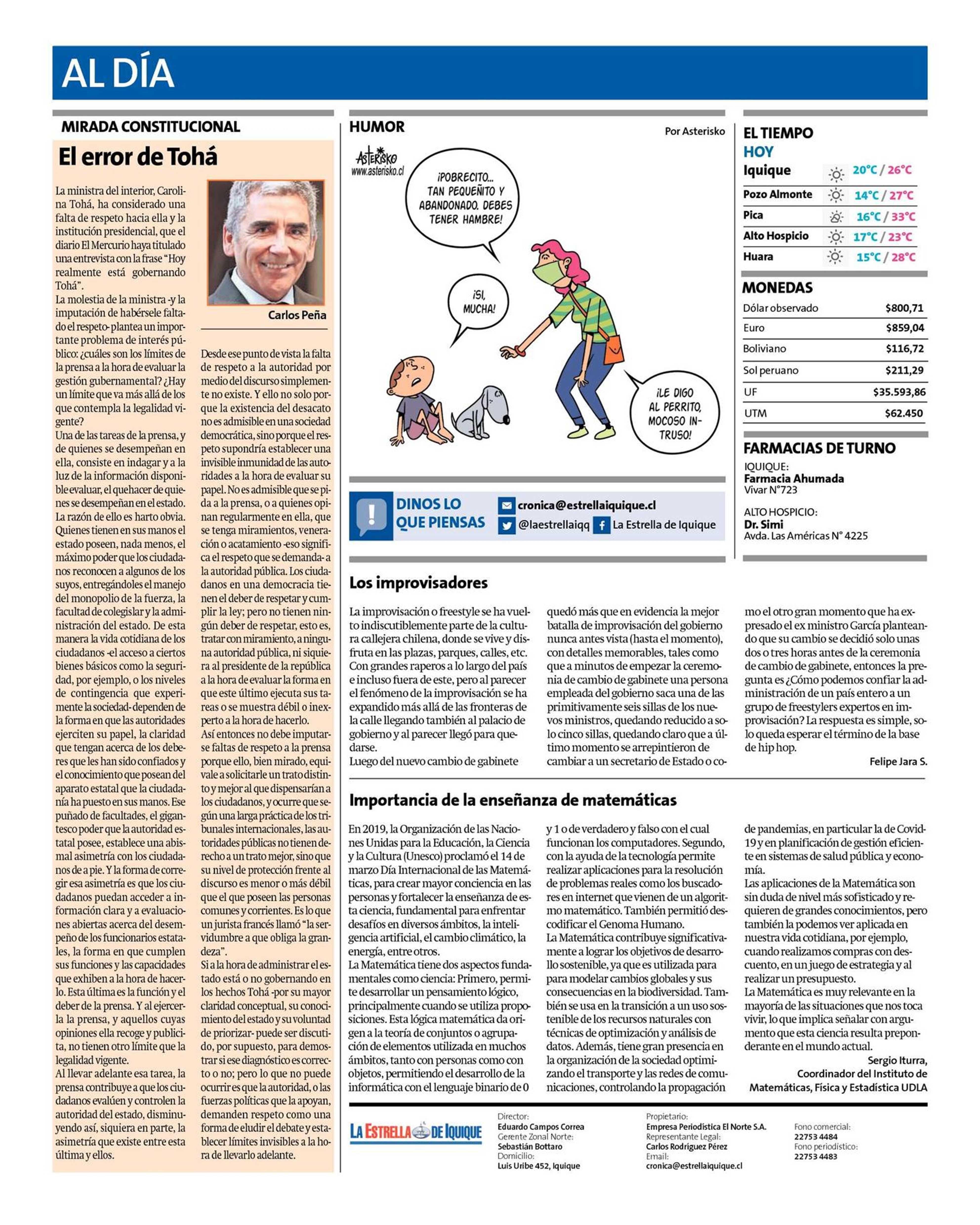 Importancia de la enseñanza de matemáticas 15-03-2023 La Estrella de Iquique |