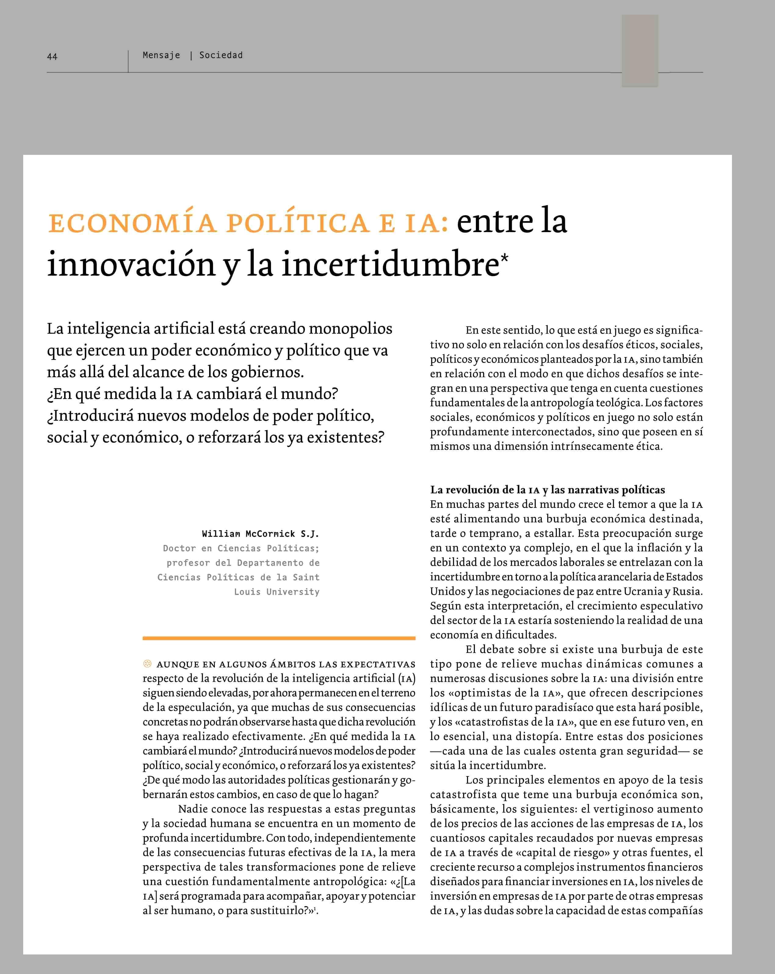 ECONOMÍA POLÍTICA E IAentre la innovación y la incertidumbre* 30-03-2026 Revista Mensaje |