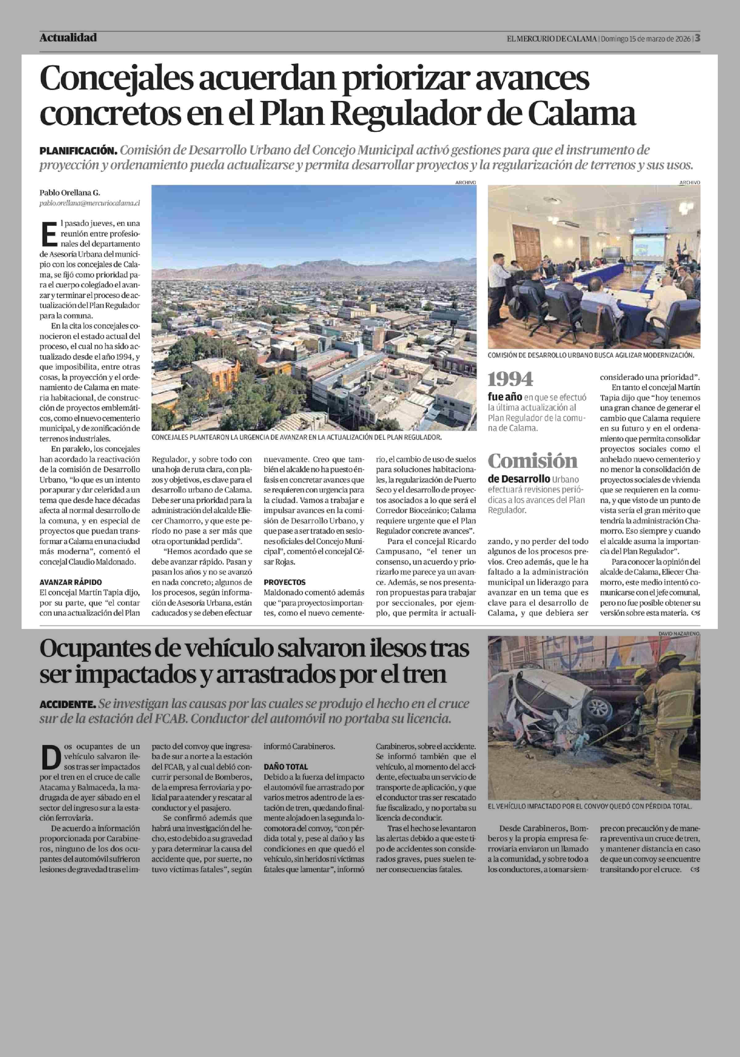 Concejales acuerdan priorizar avances concretos en el Plan Regulador de Calama 15-03-2026 El Mercurio de Calama |