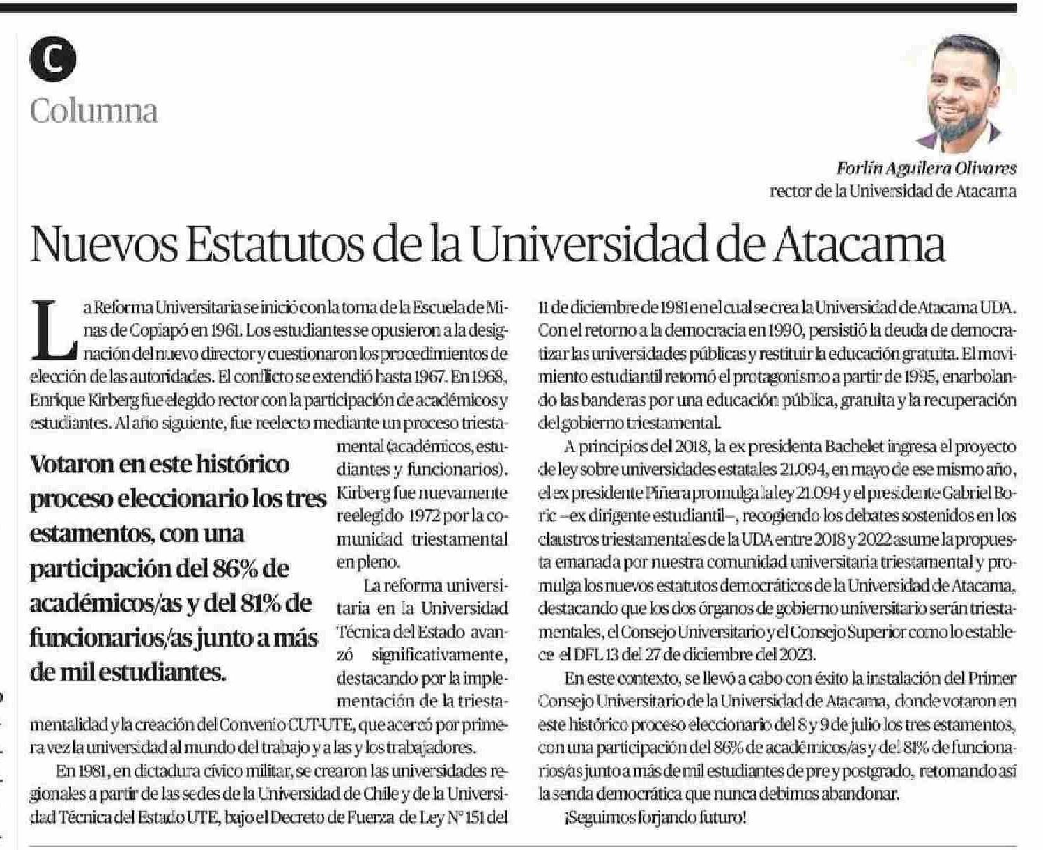 Columnas de Opinión: Nuevos Estatutos de la Universidad de Atacama 28-07-2025 El Diario de Atacama |
