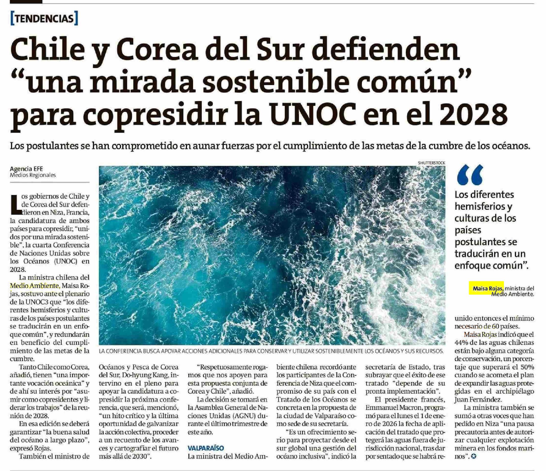 Chile y Corea del Sur defienden para copresidir la UNOC en el 2028 "una mirada sostenible común" 13-06-2025 La Estrella de Chiloé |