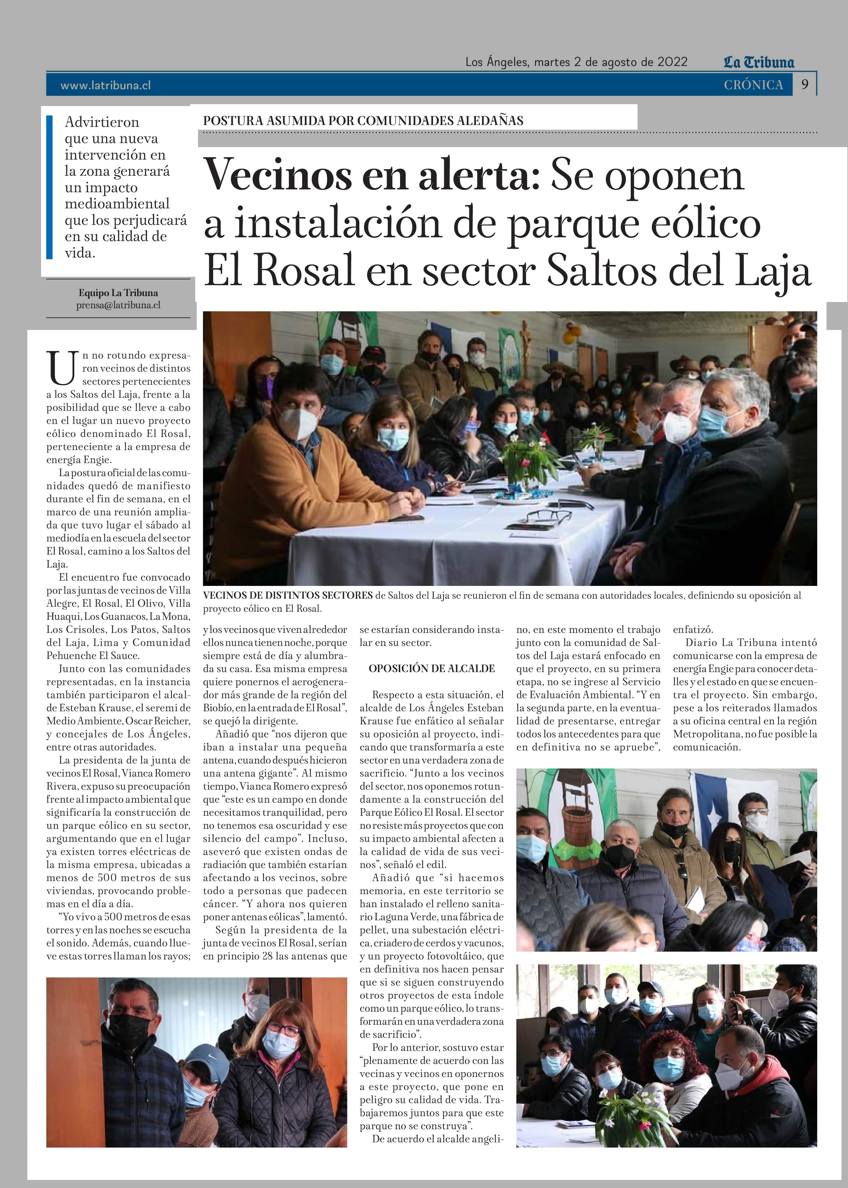 Vecinos en alerta: Se oponen a instalación de parque eólico El Rosal en sector Saltos del Laja 02-08-2022 La Tribuna |