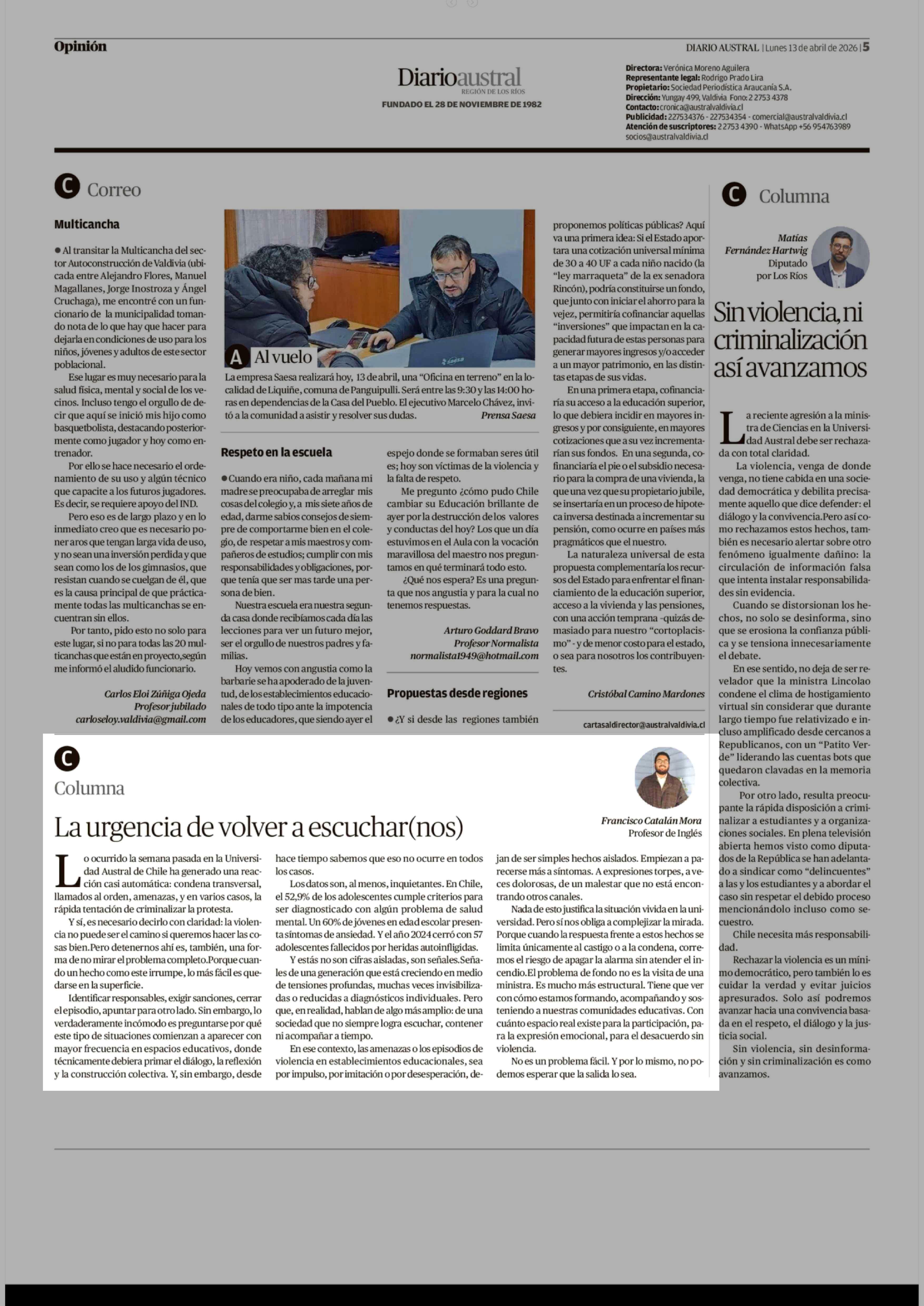 Columnas de Opinión: La urgencia de volver a escuchar(nos) 13-04-2026 Diario Austral Región de Los Ríos |