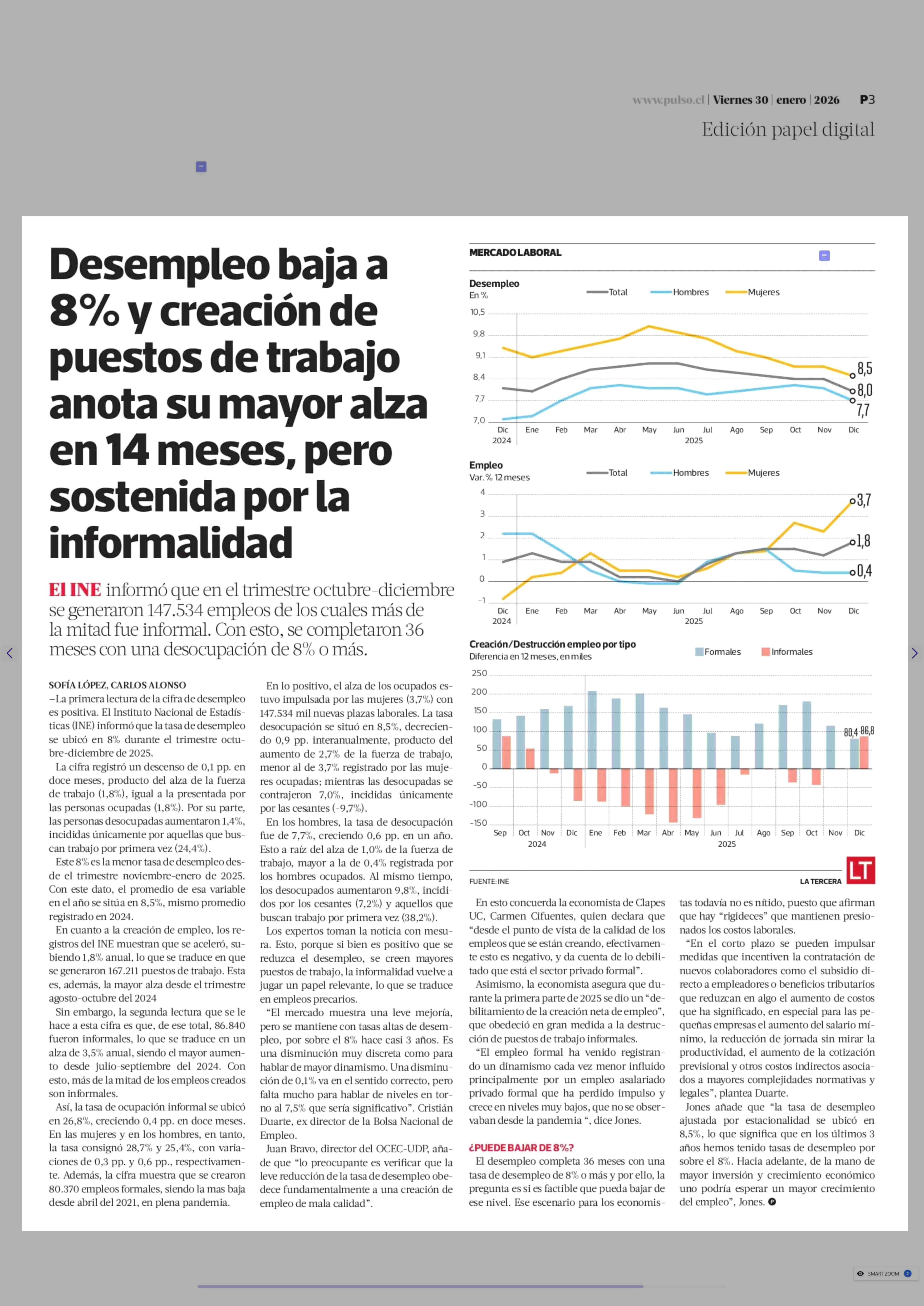Título: Desempleo baja a 8% y creación de puestos de trabajo anota su mayor alza en 14 meses, pero sostenida por la informalidad