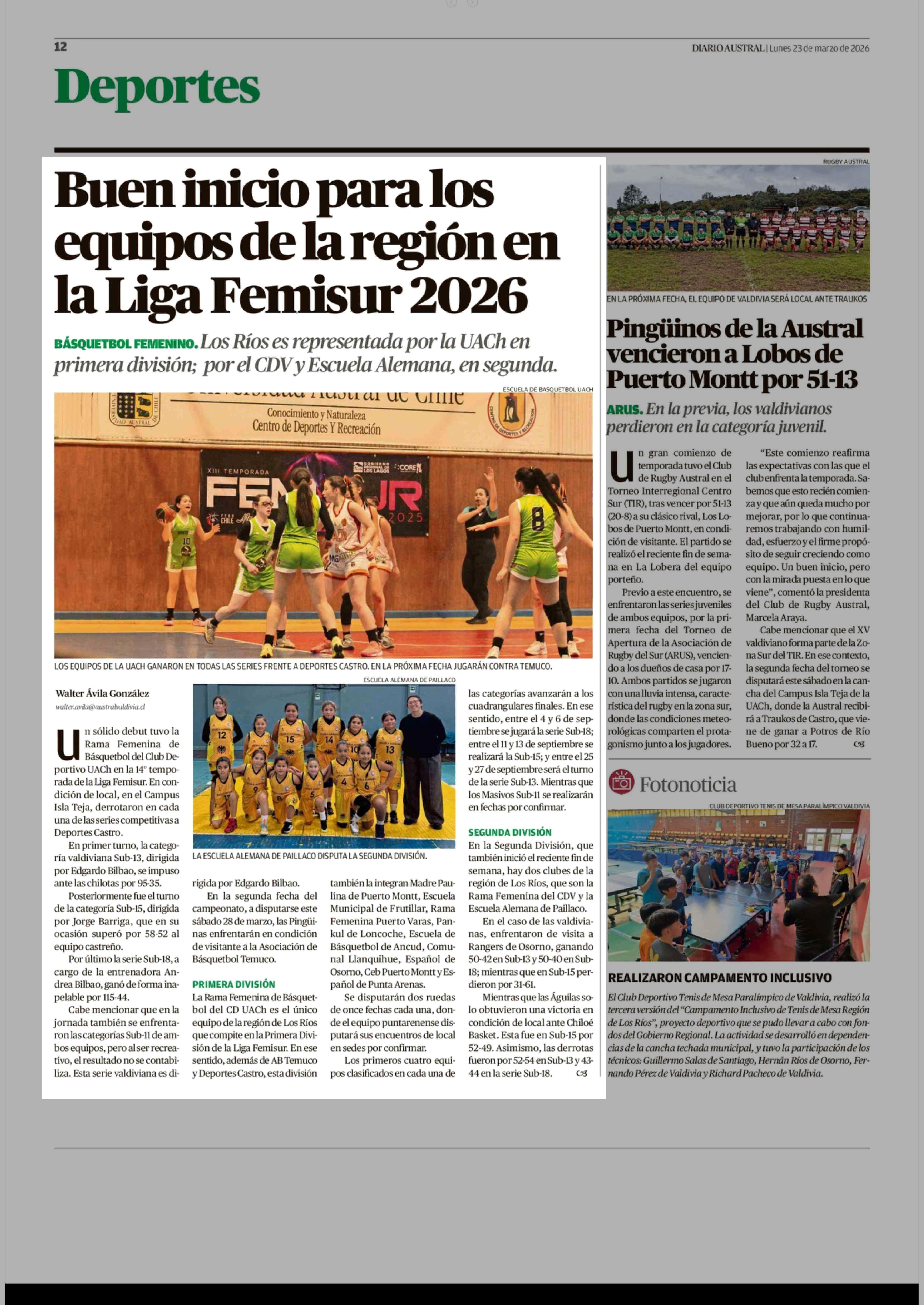 Buen inicio para los equipos de la región en la Liga Femisur 2026 23-03-2026 Diario Austral Región de Los Ríos |