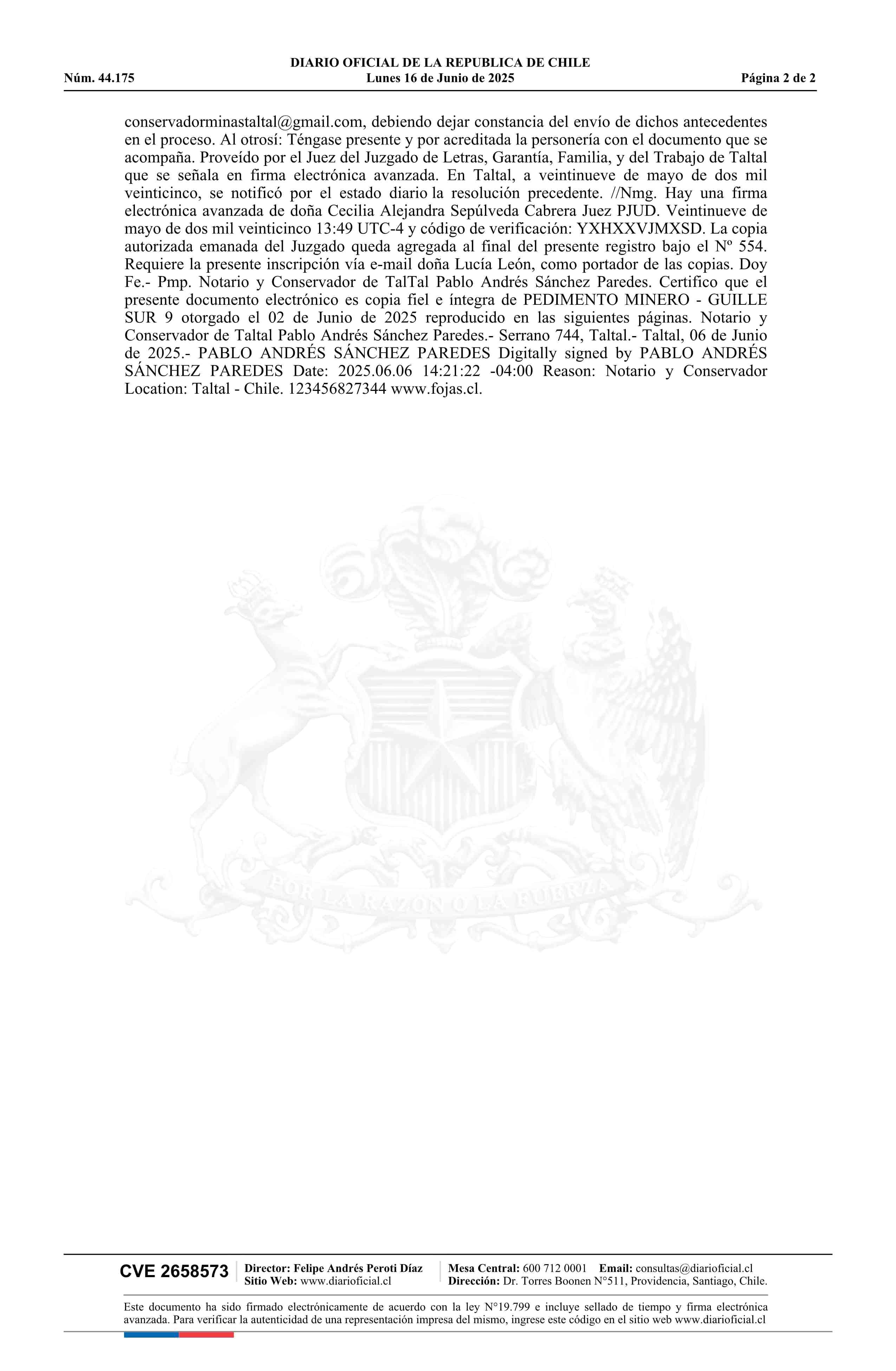GUILLE SUR 9 / Vale Exploraciones Chile Limitada 16-06-2025 DIARIO OFICIAL CHILE - BOLETÍN OFICIAL DE MINERÍA |