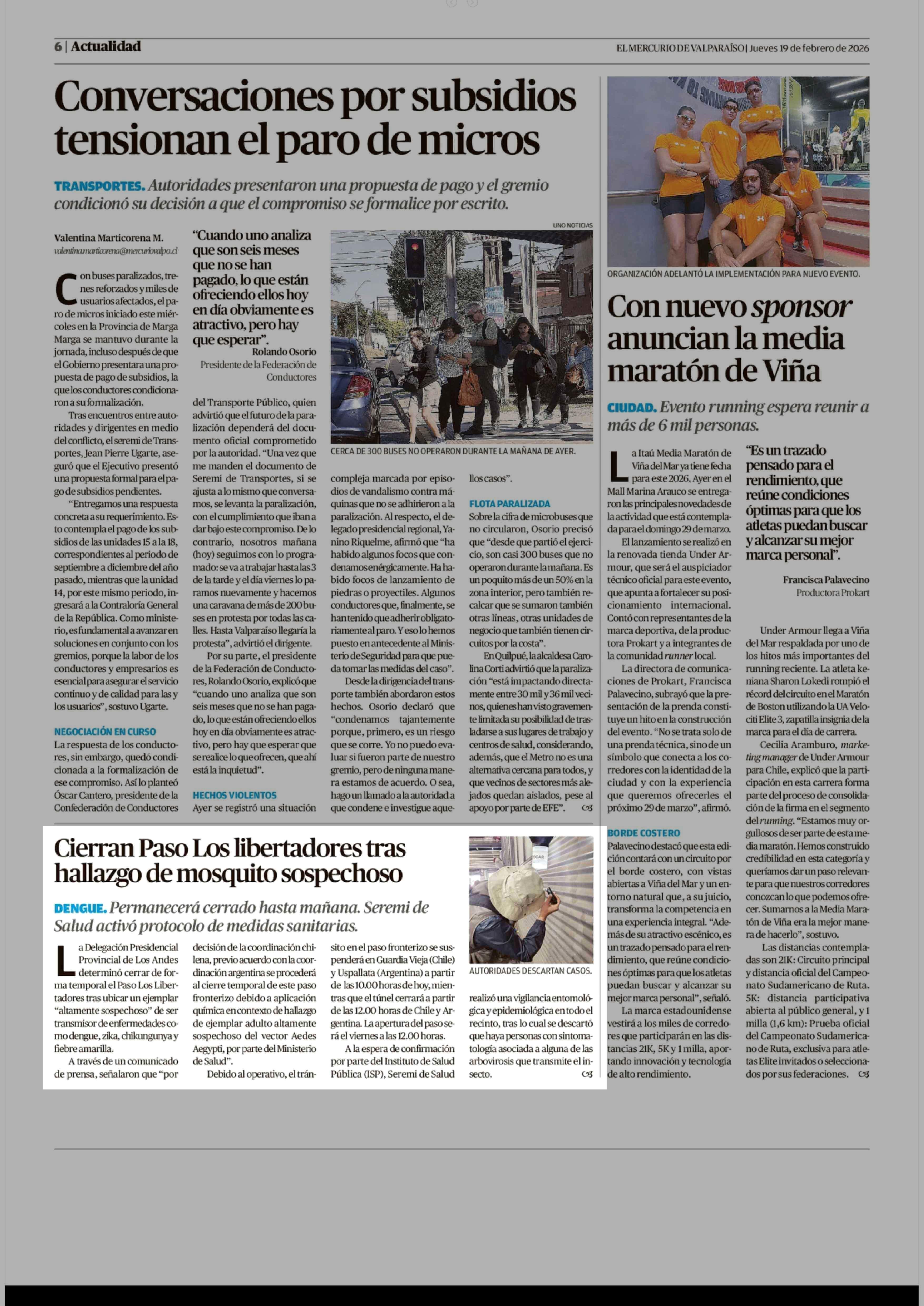 Cierran Paso Los libertadores tras hallazgo de mosquito sospechoso 19-02-2026 El Mercurio de Valparaíso |