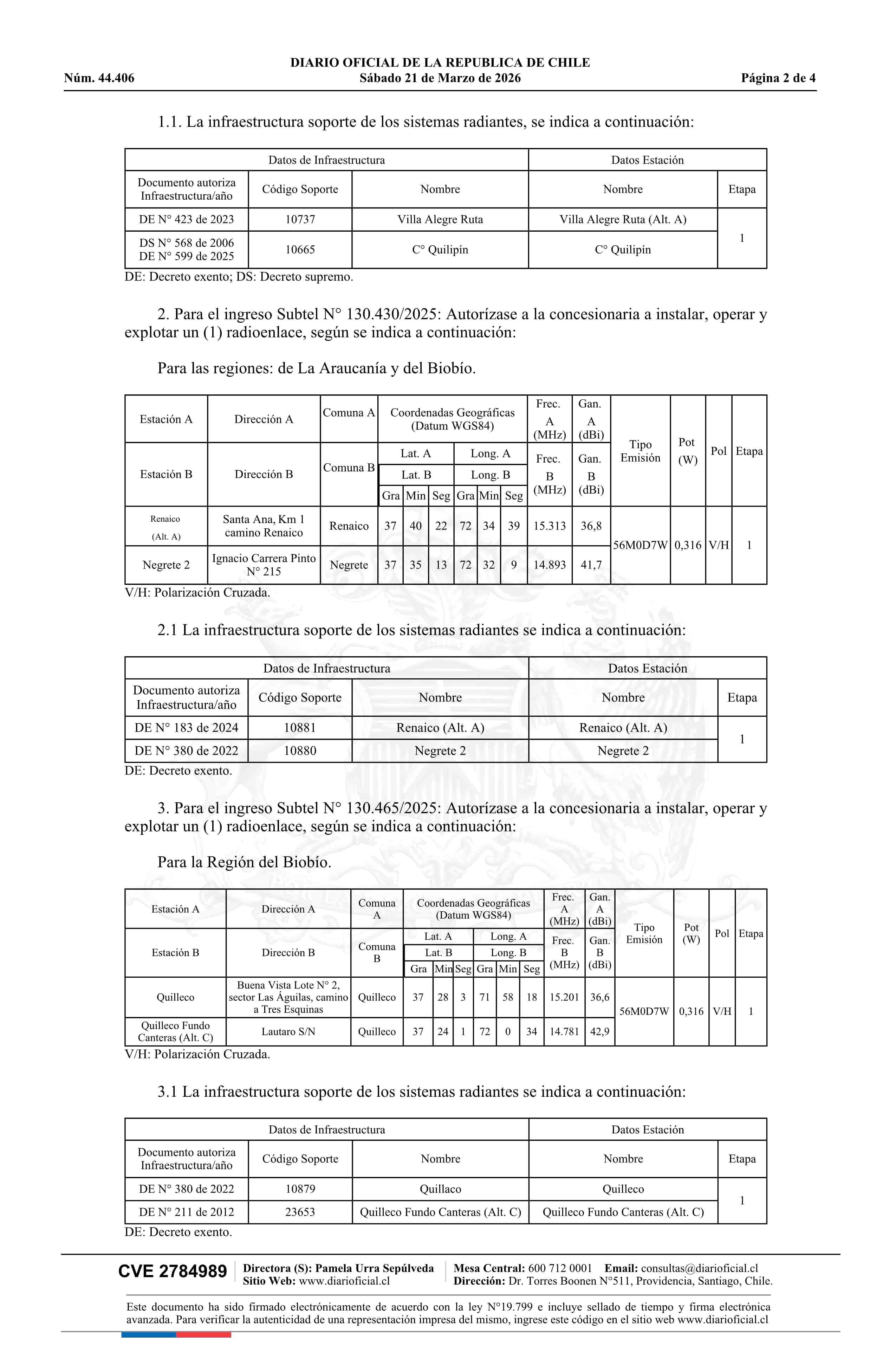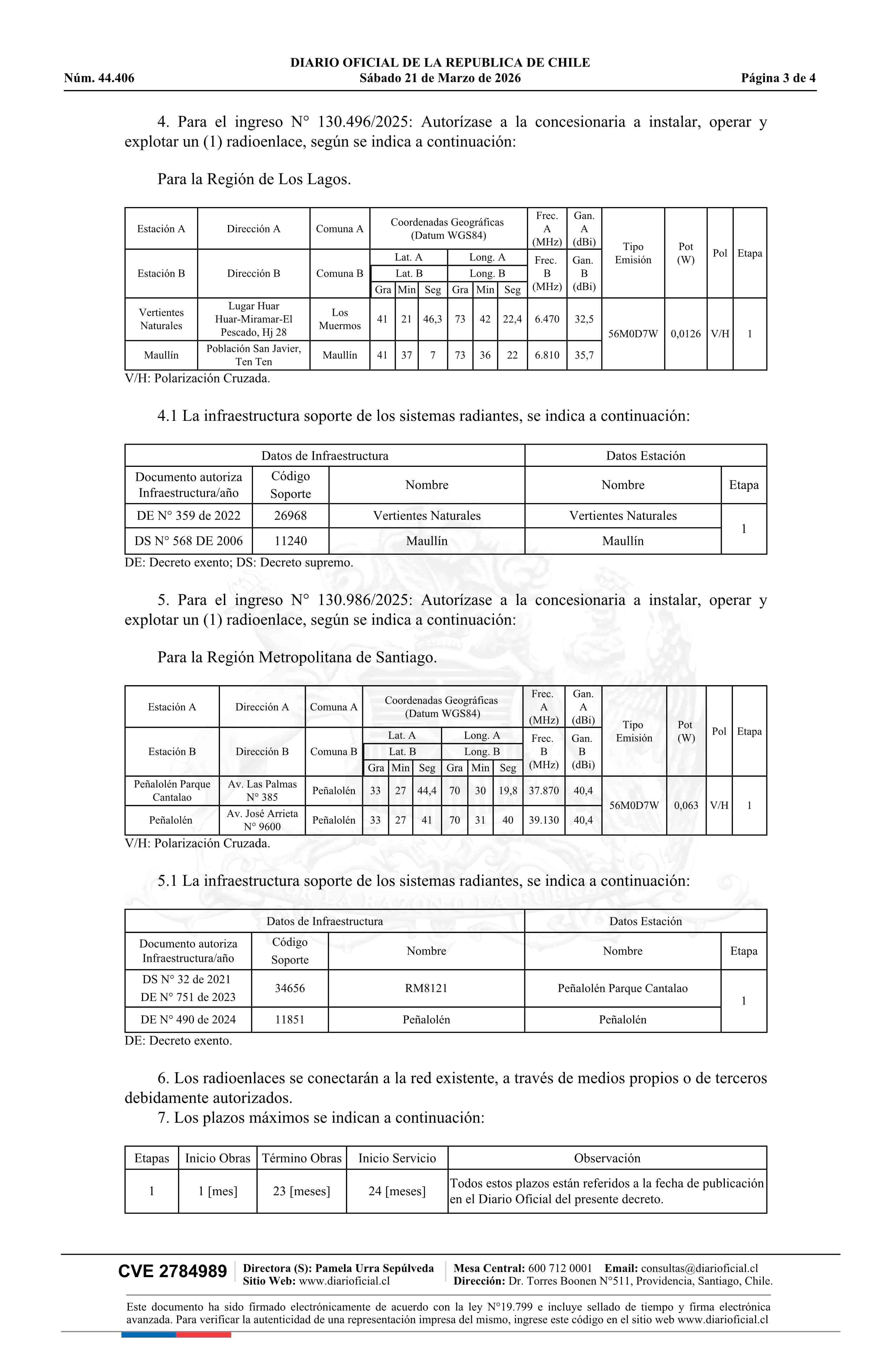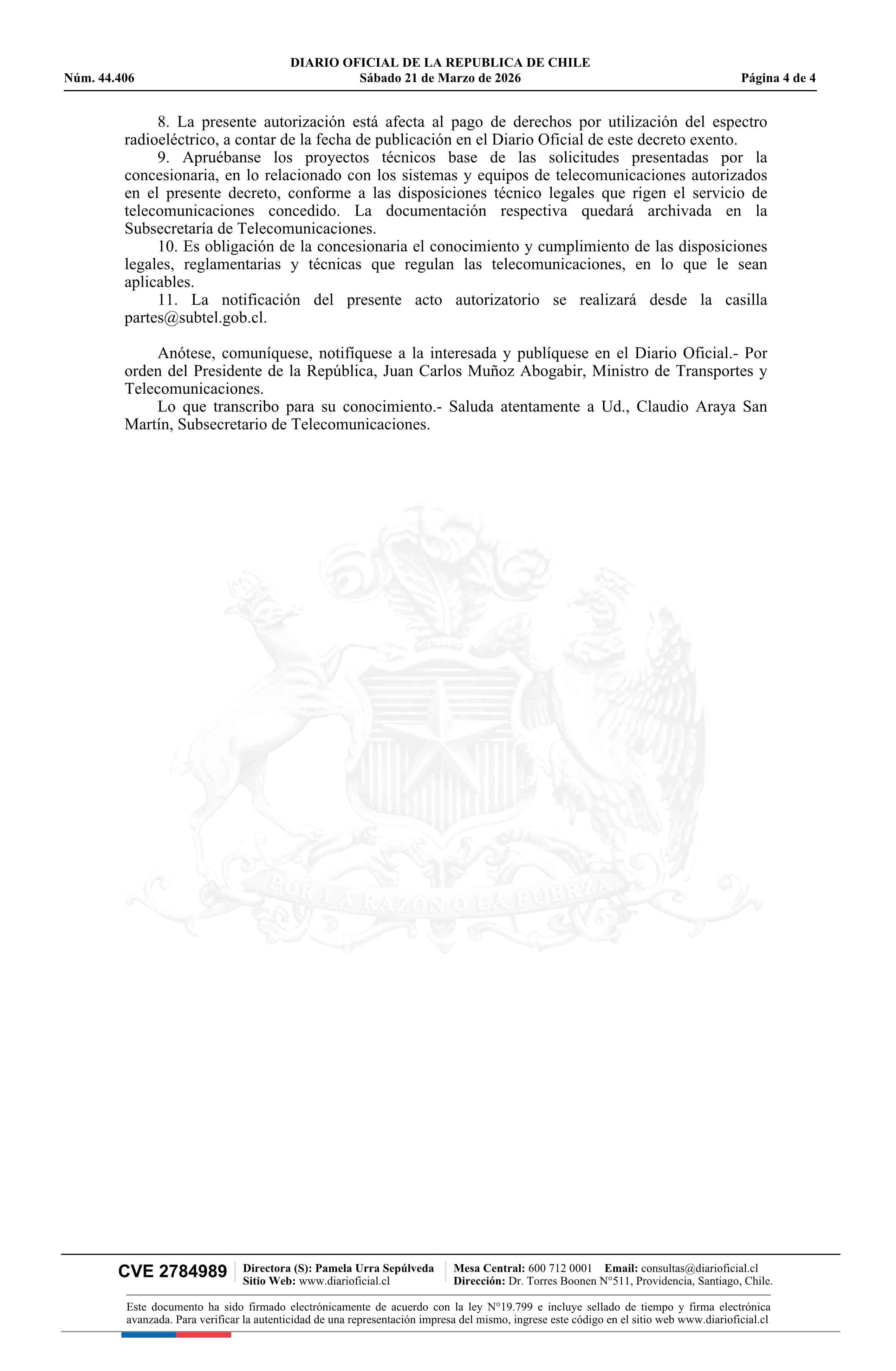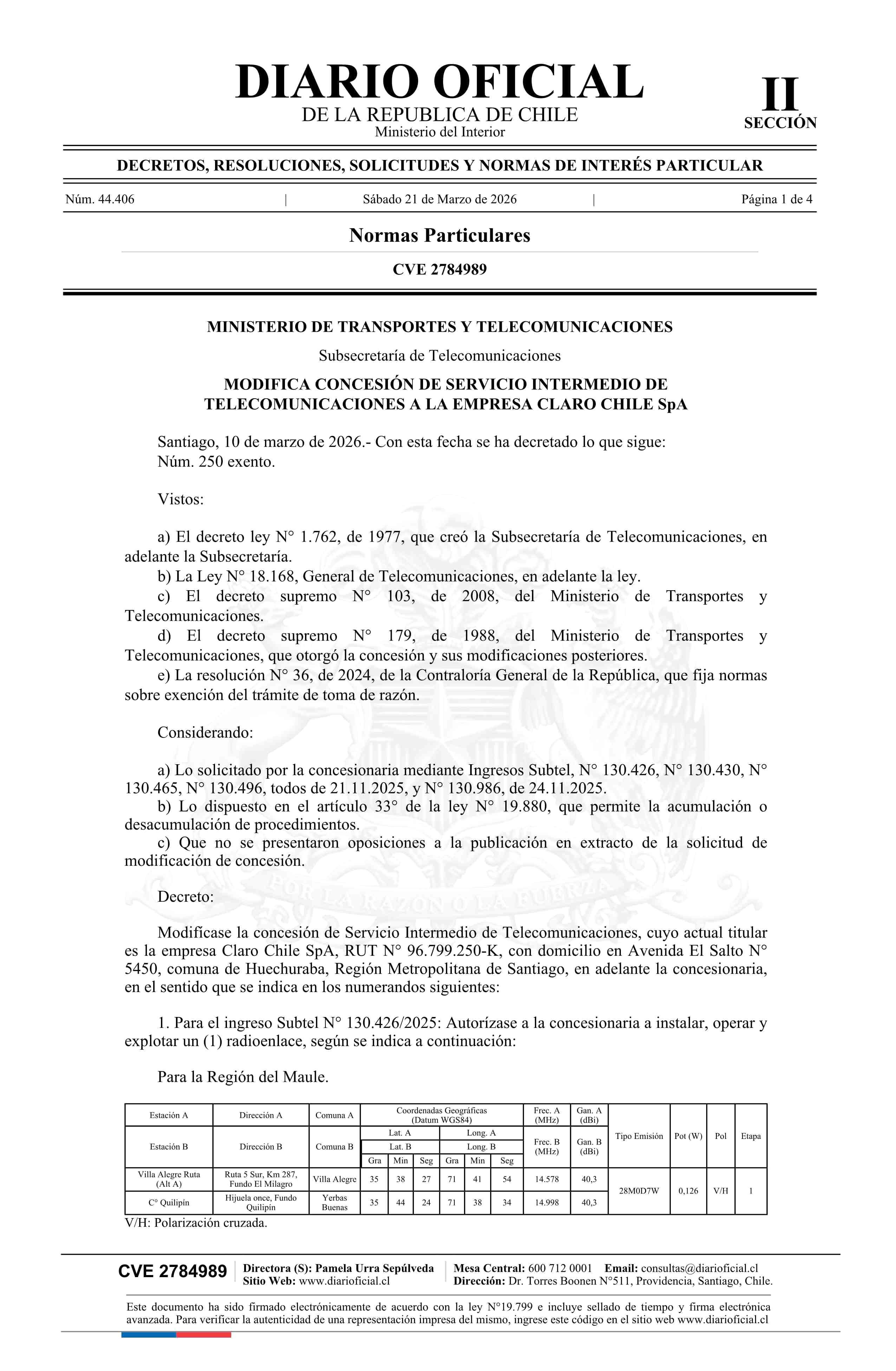 Decreto exento número 250, de 2026.- Modifica concesión de servicio intermedio de telecomunicaciones a la empresa Claro Chile SpA 21-03-2026 Diario Oficial Edición Electrónica |