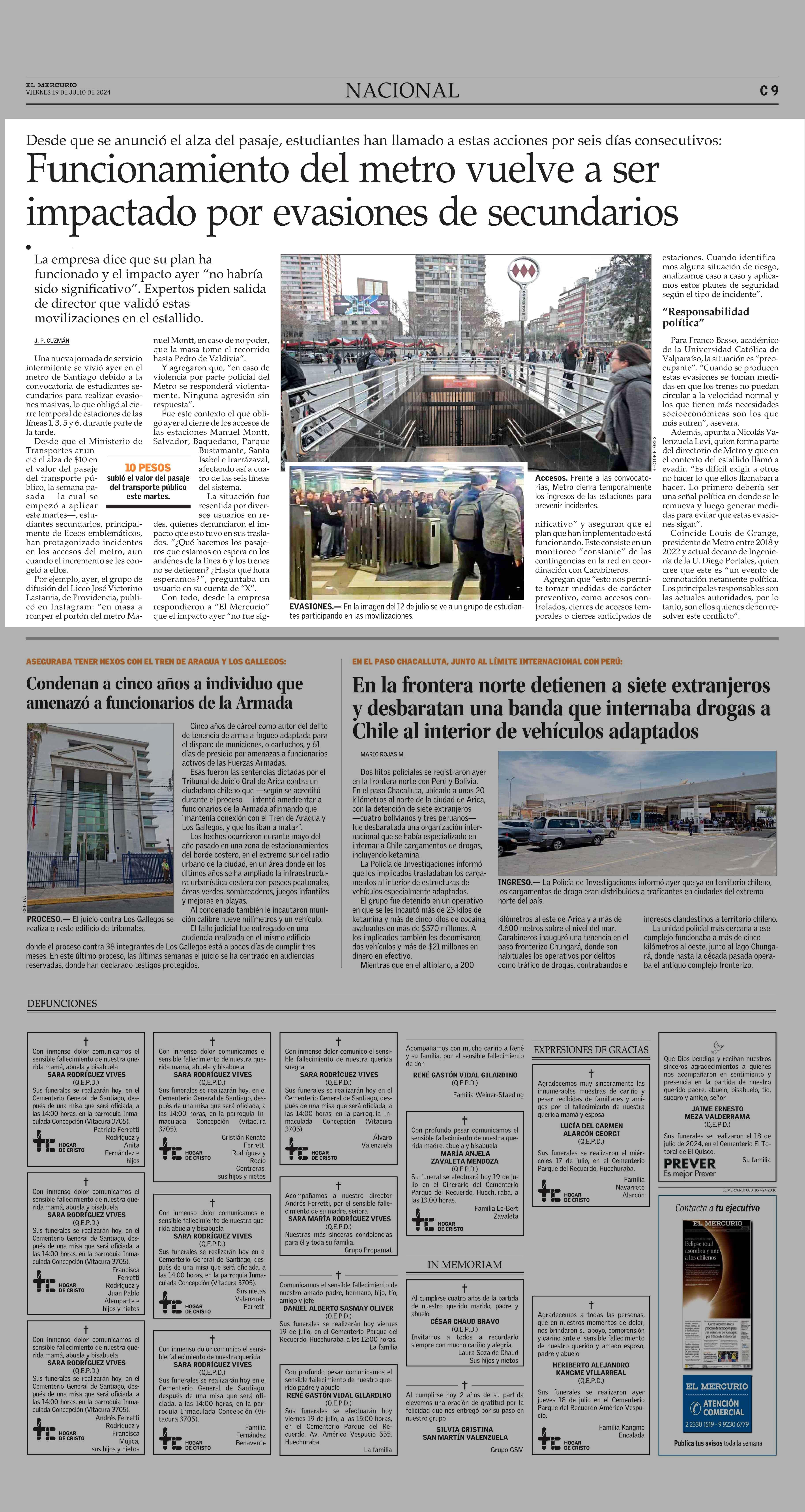 Funcionamiento del metro vuelve a ser impactado por evasiones de secundarios 19-07-2024 El Mercurio |