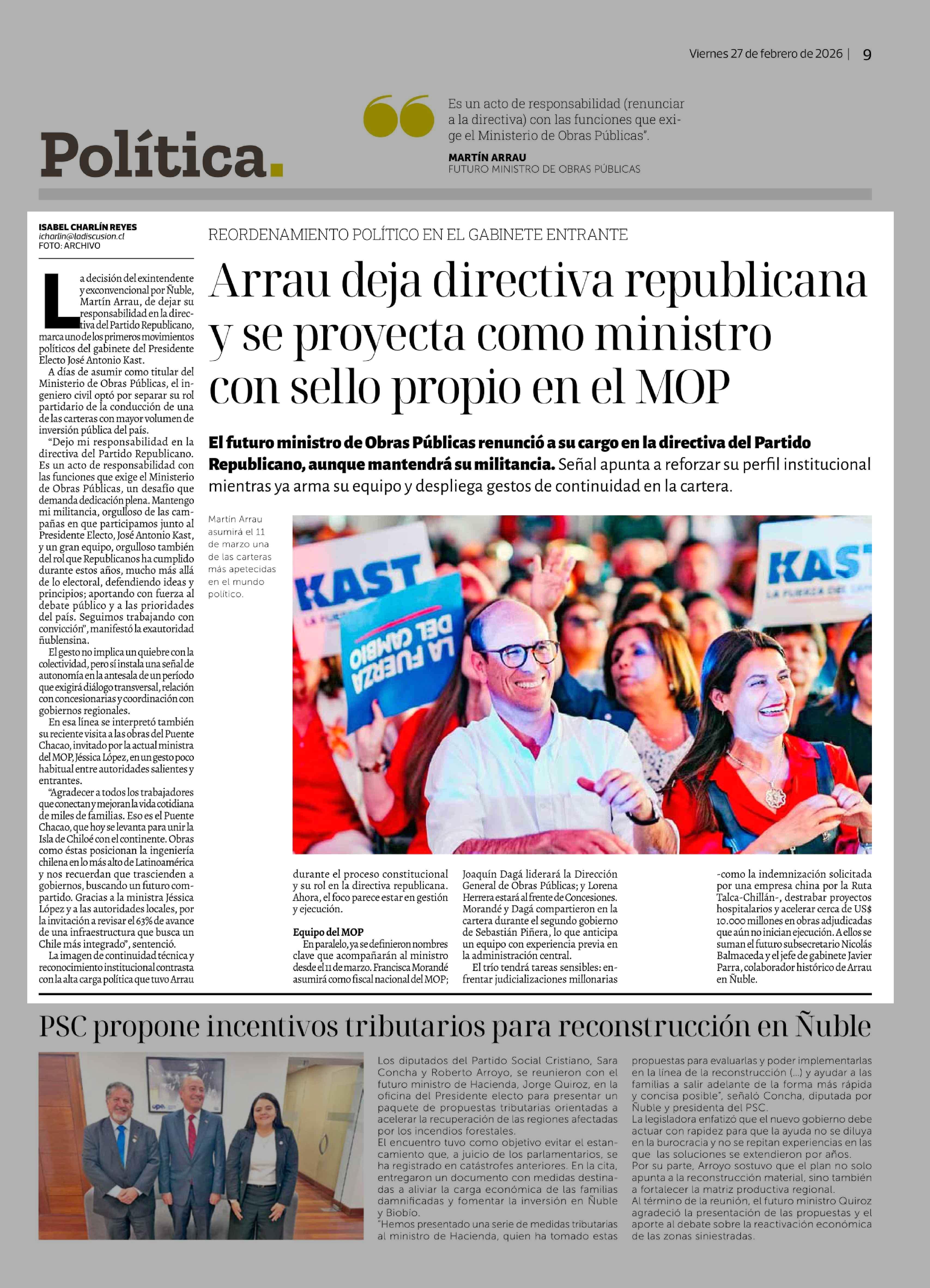 Título: Arrau deja directiva republicana y se proyecta como ministro con sello propio en el MOP