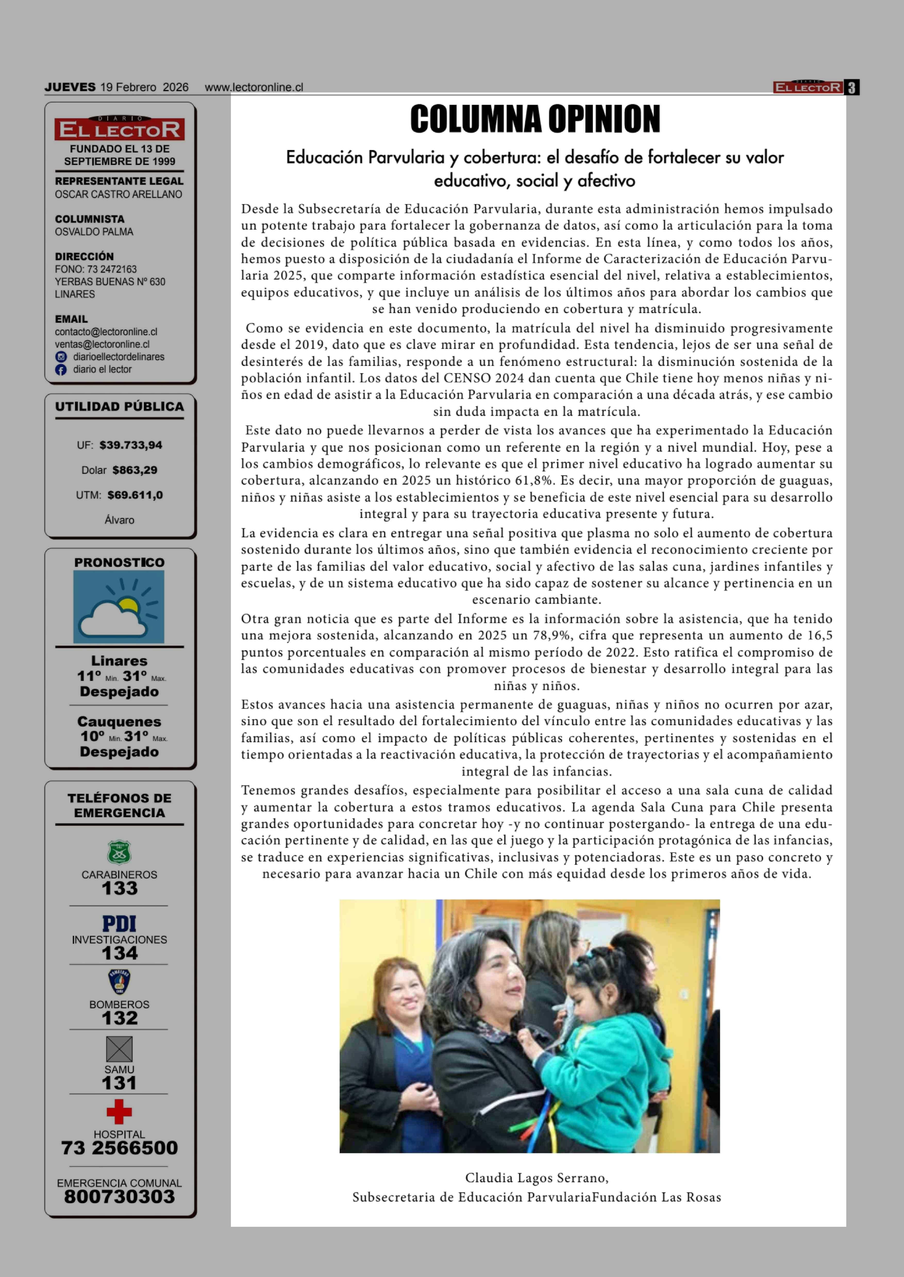 Columnas de Opinión: Educación Parvularia y cobertura: el desafío de fortalecer su valor educativo, social y afectivo 19-02-2026 El Lector |