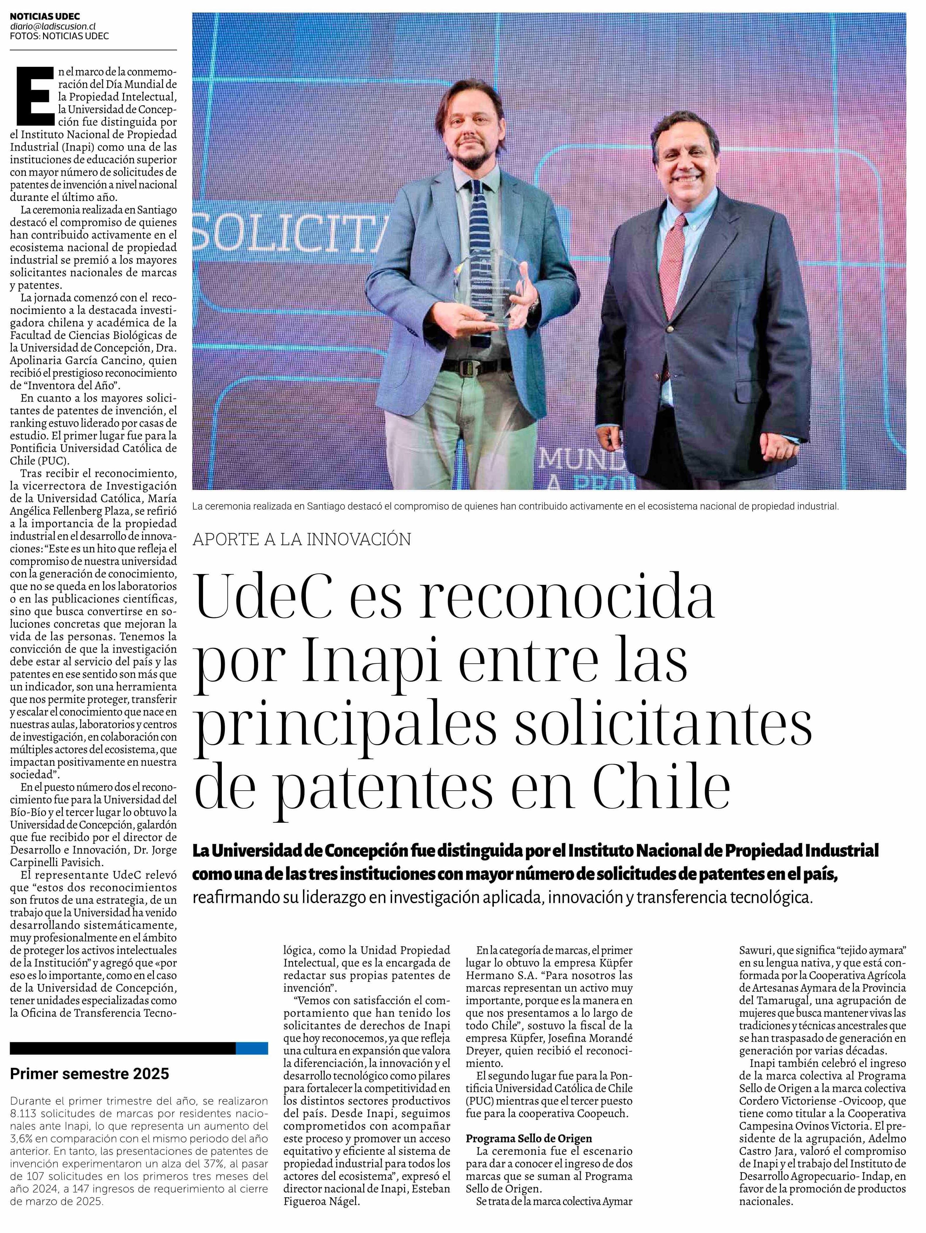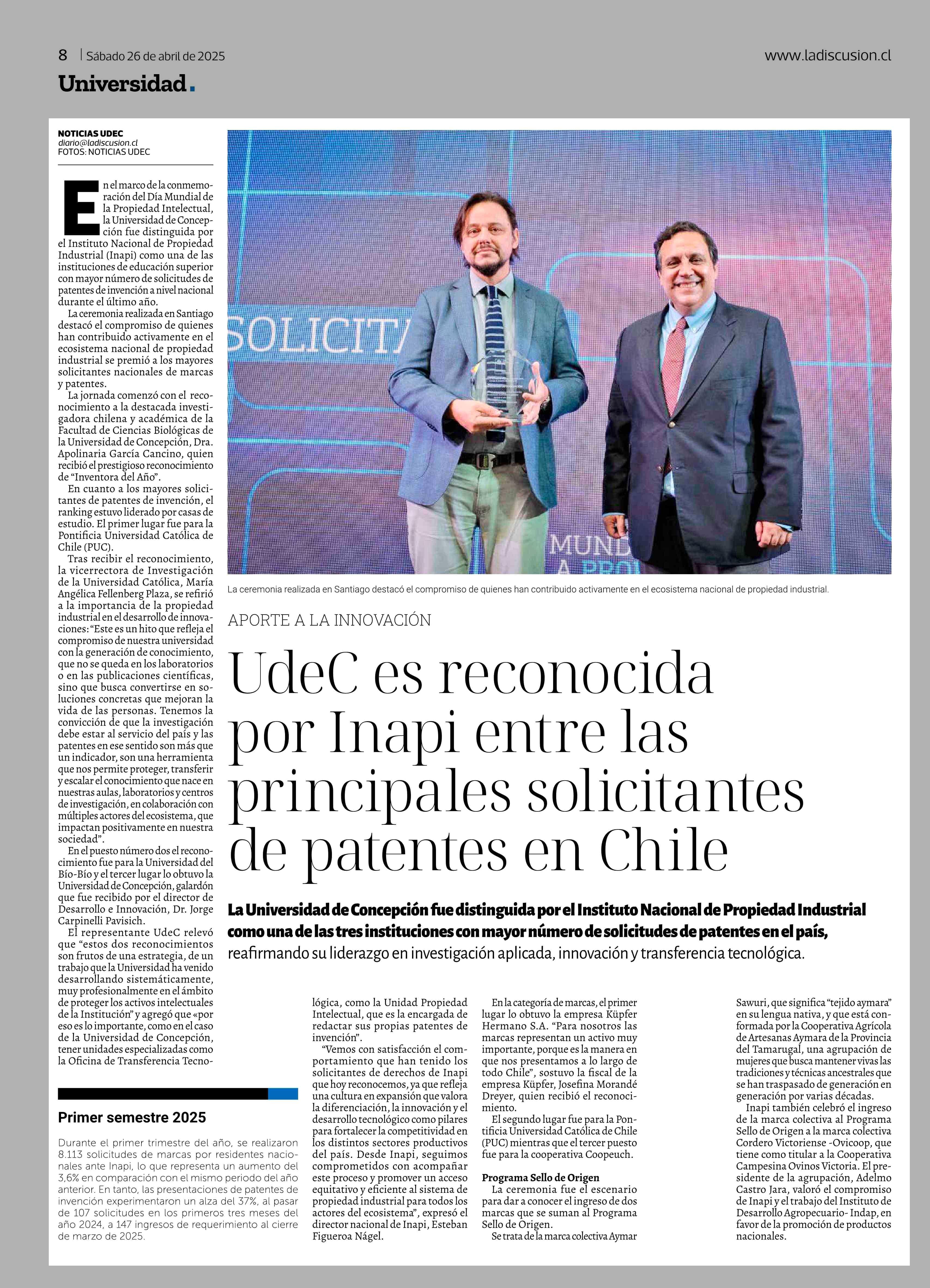 UdeC es reconocida por Inapi entre las principales solicitantes de patentes en Chile 26-04-2025 La Discusión |
