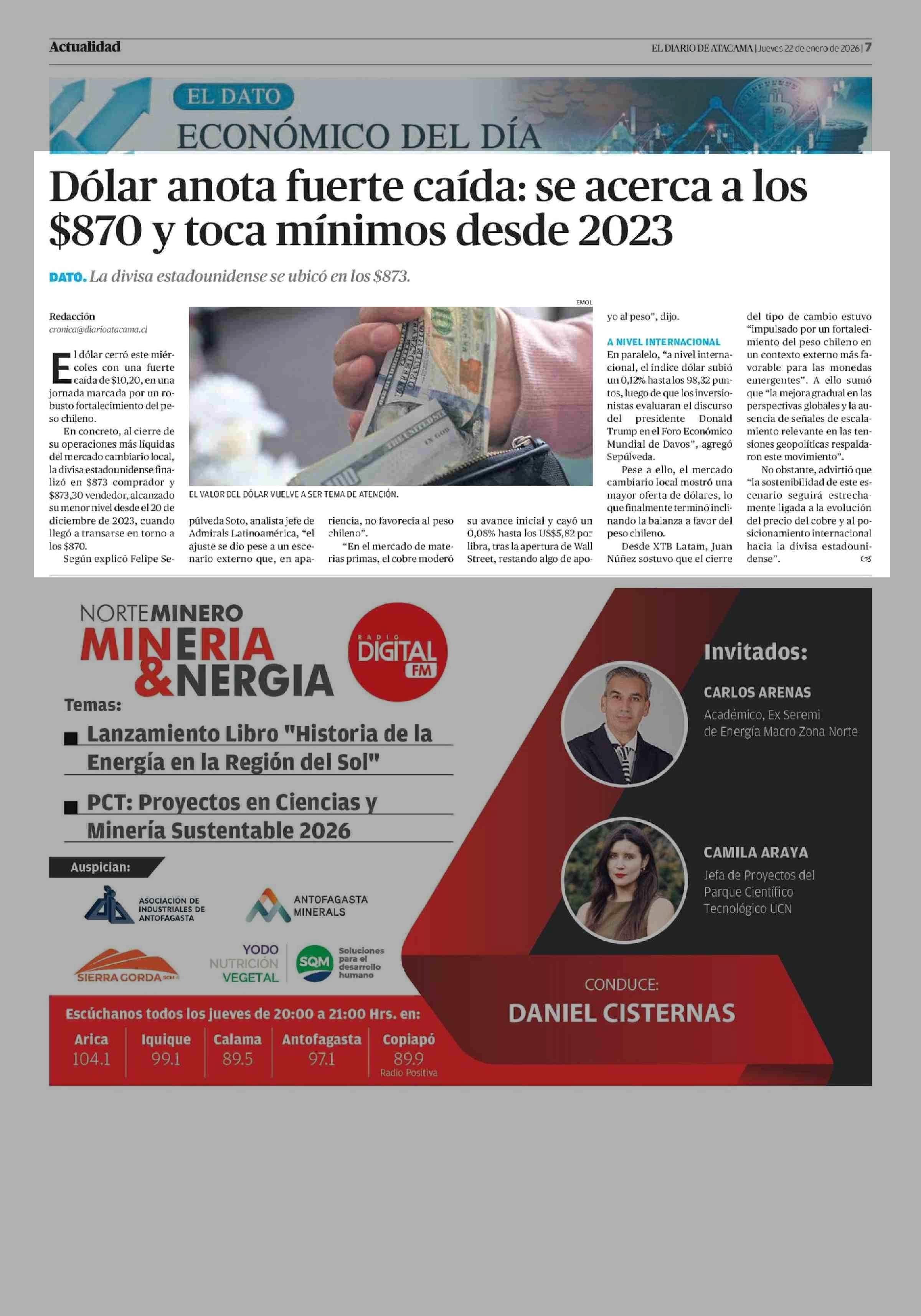 Dólar anota fuerte caída: se acerca a los $870 y toca mínimos desde 2023 22-01-2026 El Diario de Atacama |