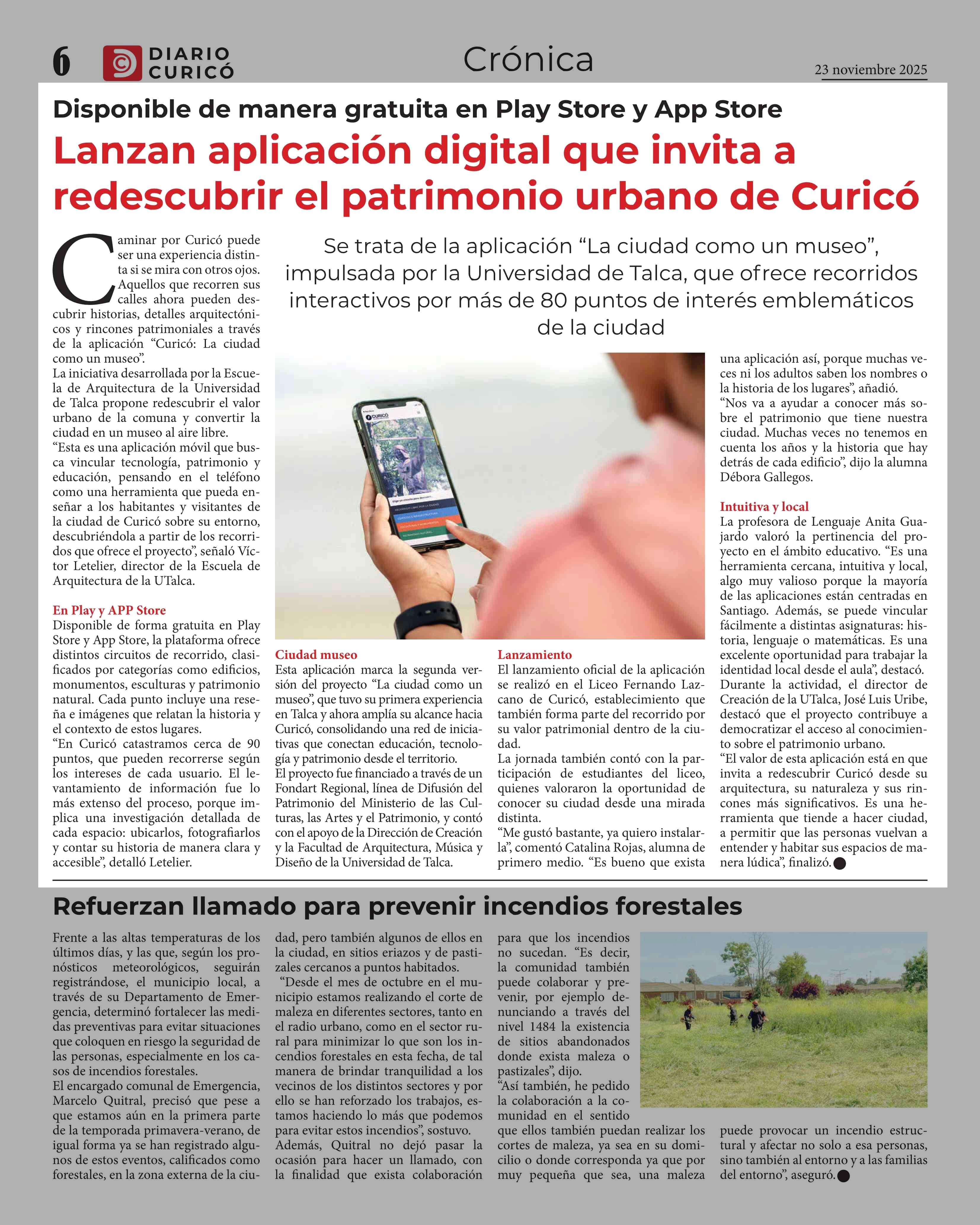 Disponible de manera gratuita en Play Store y App Store Lanzan aplicación digital que invita a redescubrir el patrimonio urbano de Curicó 30-11-2025 Diario Talca |