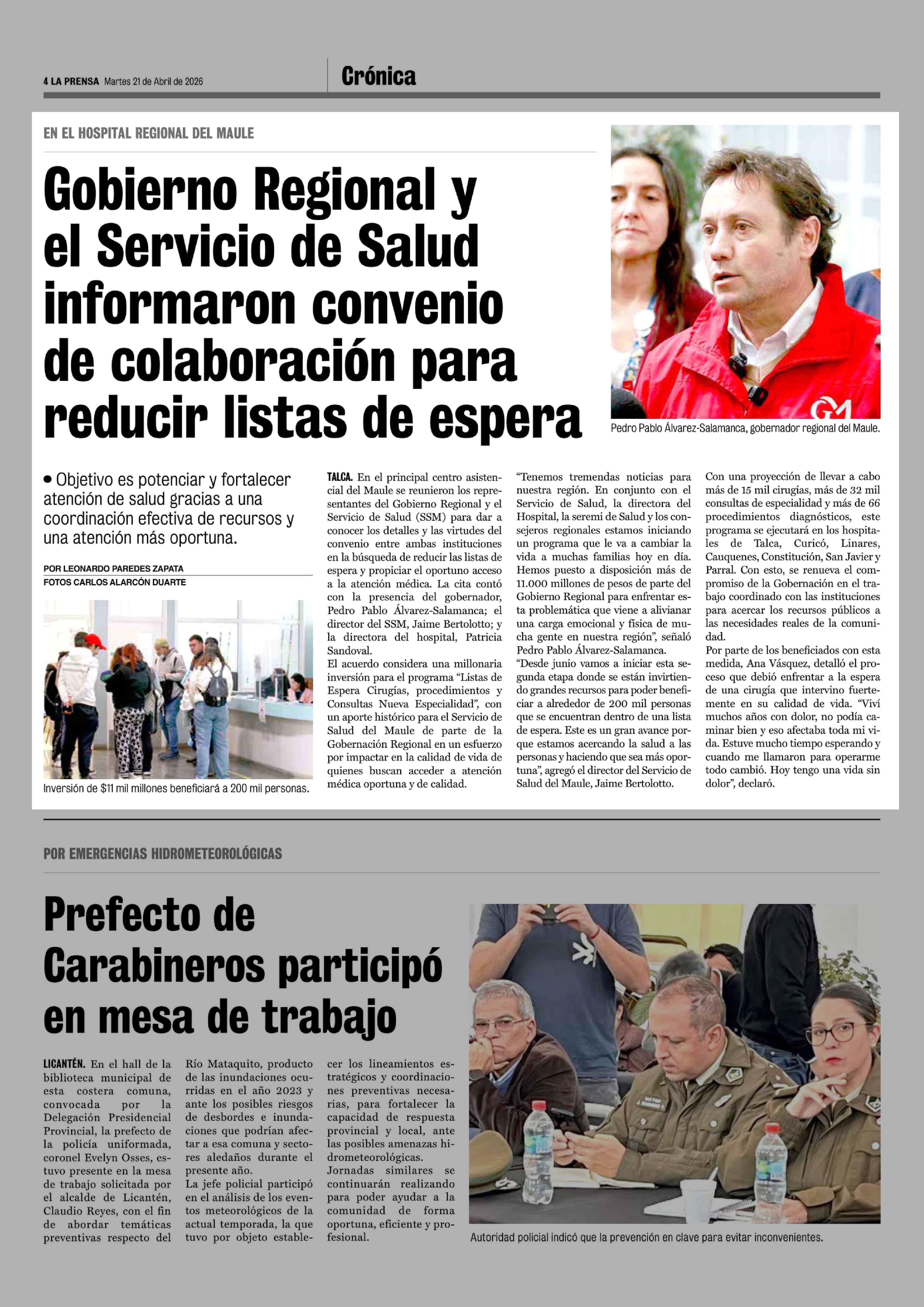Gobierno Regional y el Servicio de Salud informaron convenio de colaboración para reducir listas de espera 21-04-2026 La Prensa de Curicó |
