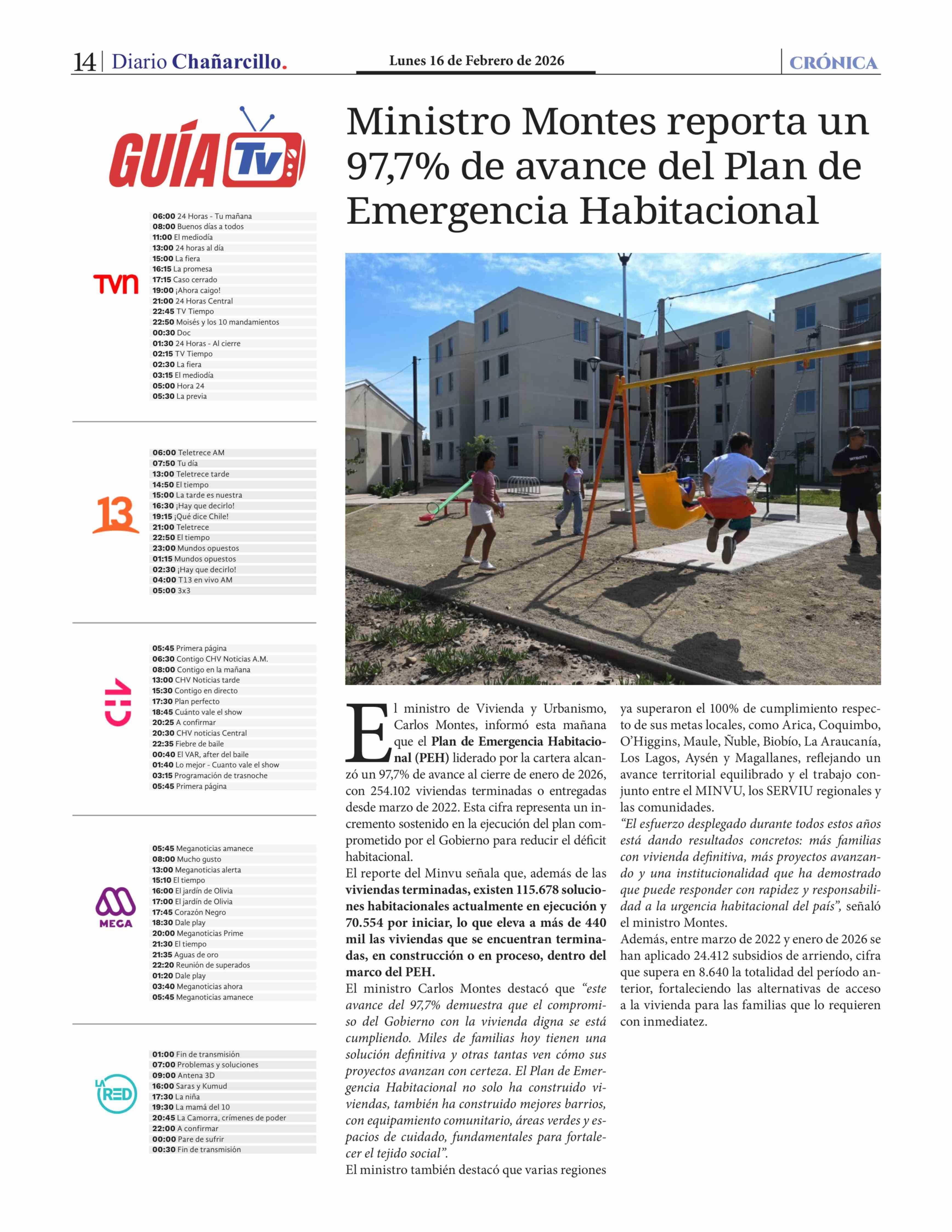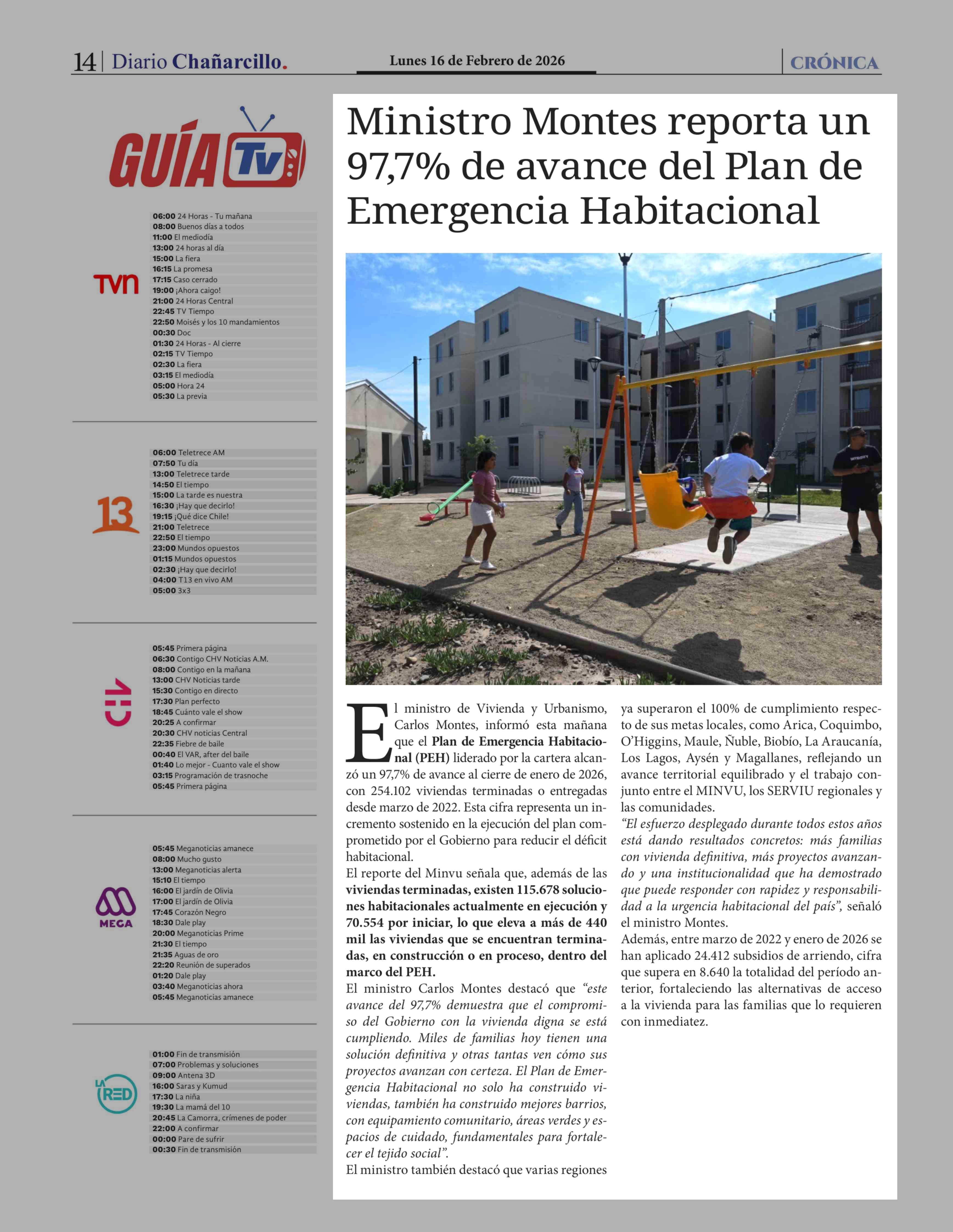 Ministro Montes reporta un 97,7% de avance del Plan de Emergencia Habitacional 16-02-2026 Diario Chañarcillo |