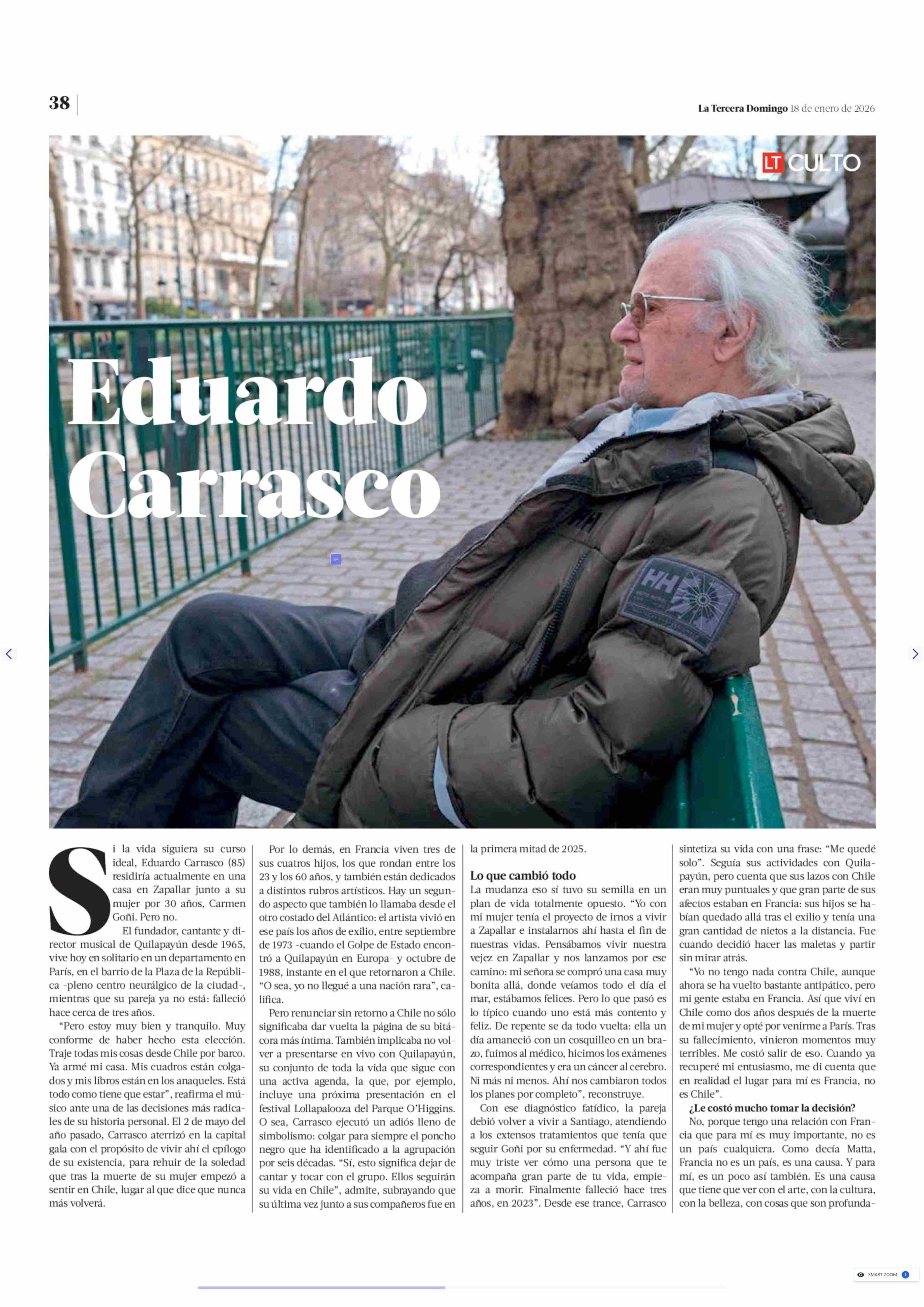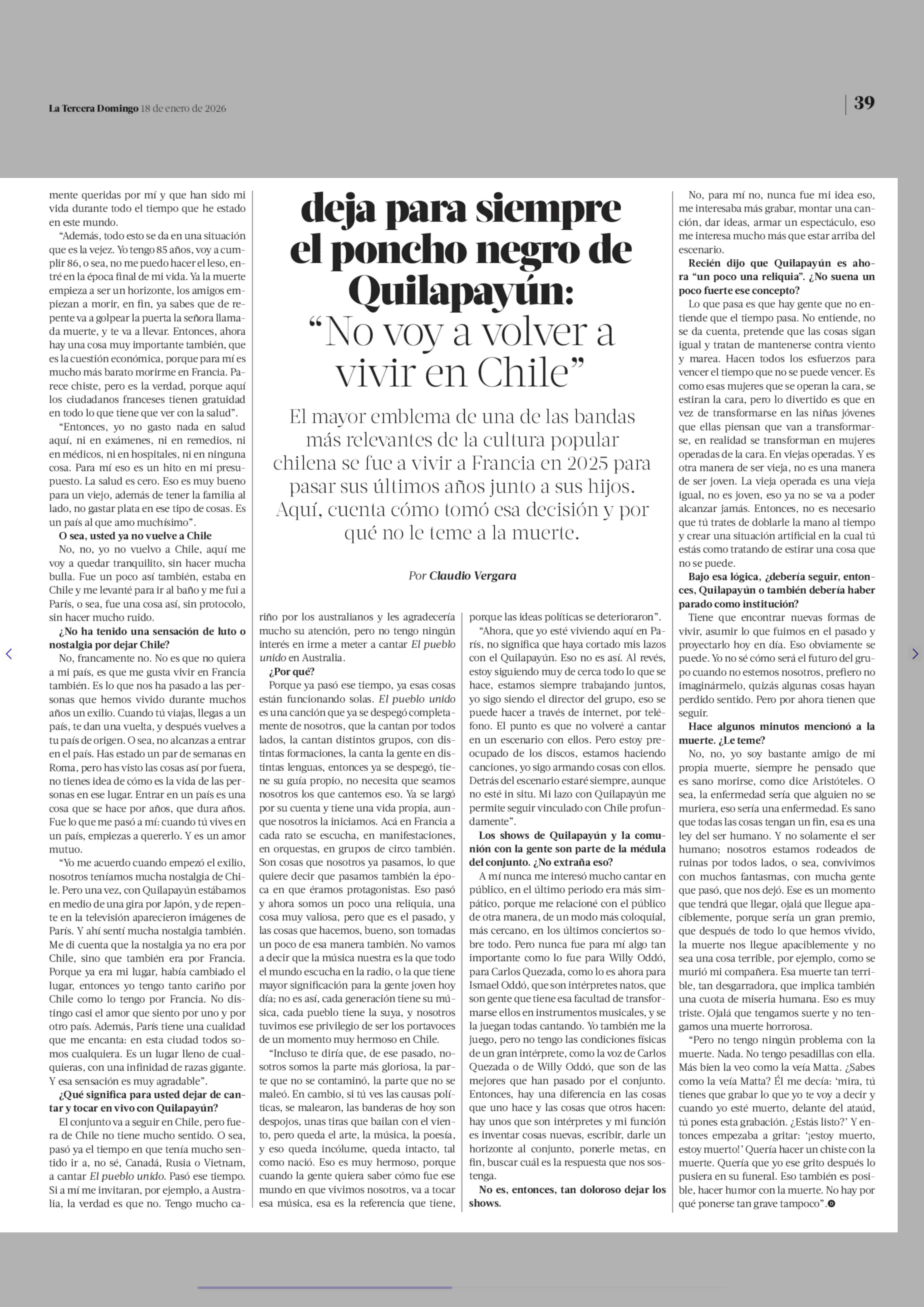 Deja para siempre el poncho negro de Quilapayún: "No voy a volver a vivir en Chile" 18-01-2026 La Tercera |