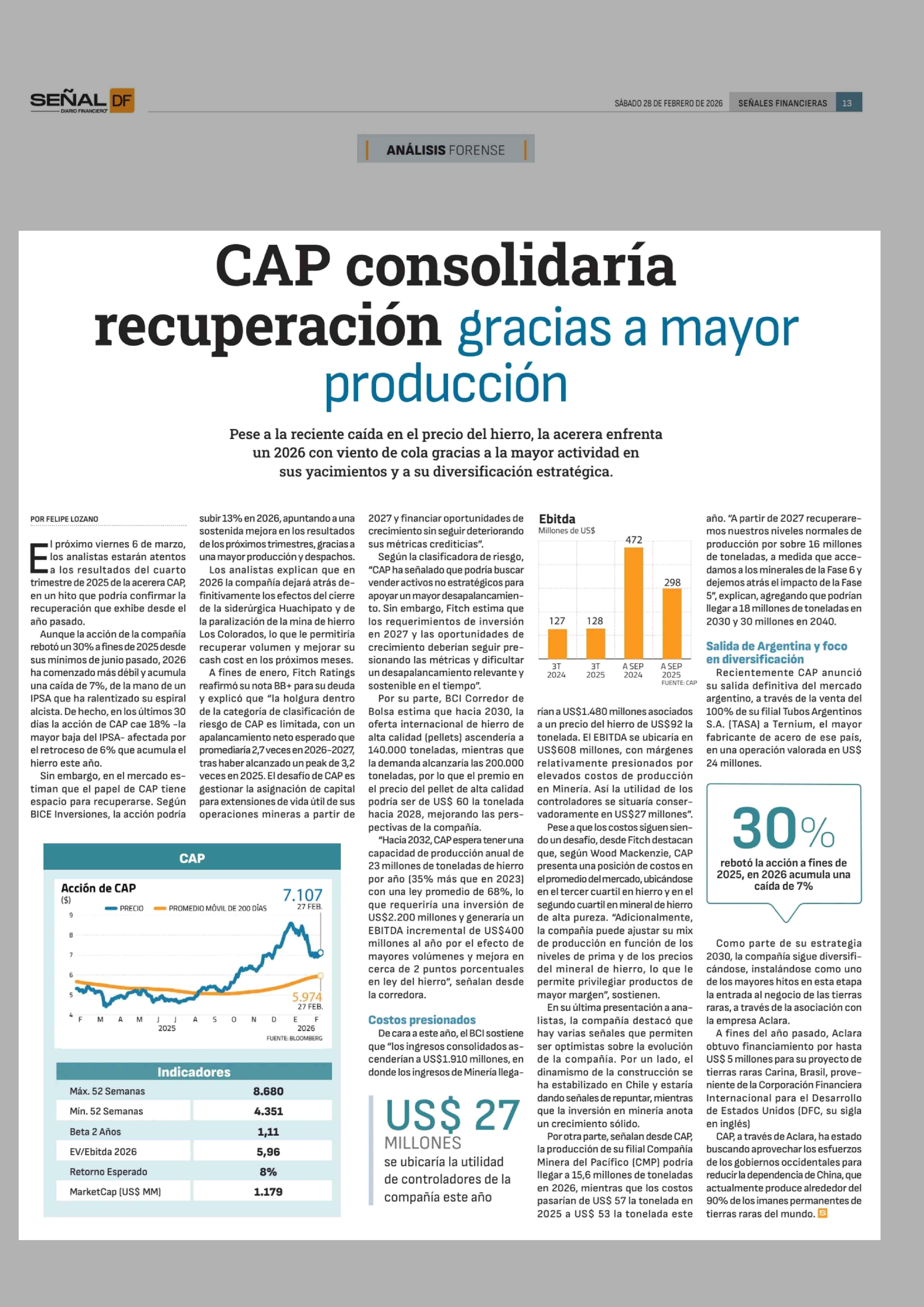 CAP consolidaría recuperación gracias a mayor producción 28-02-2026 Diario Financiero |