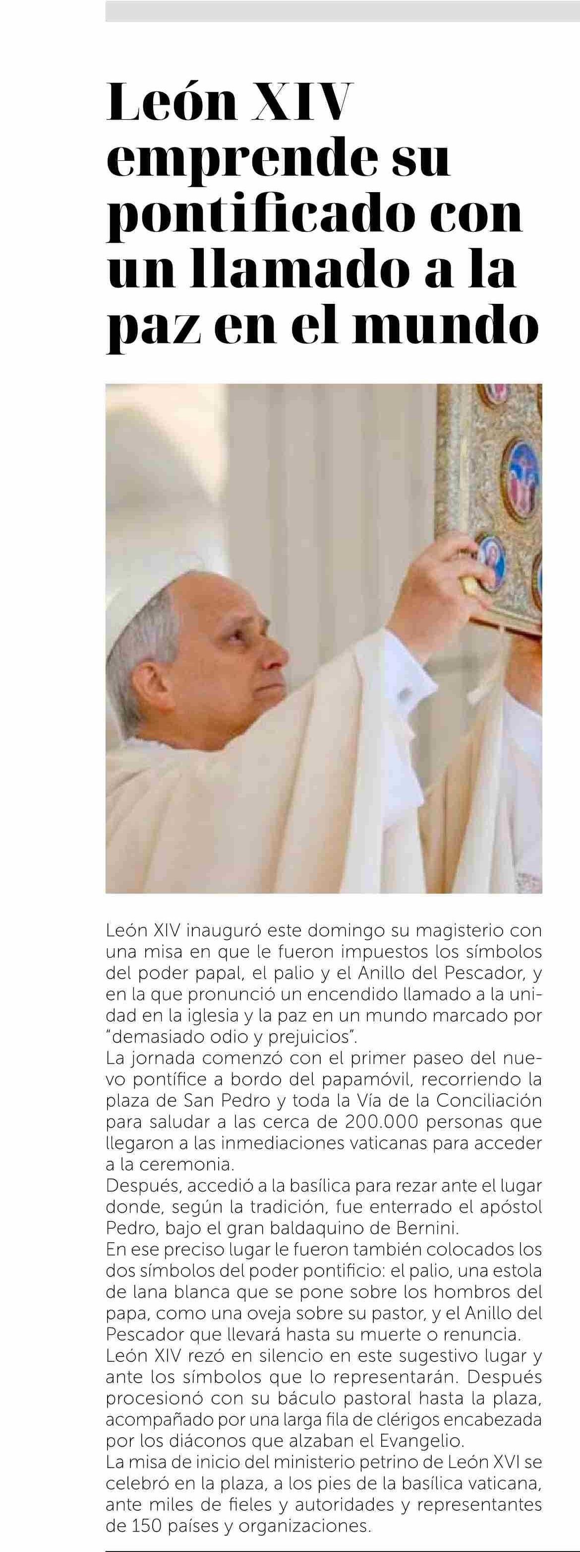 | Título: | León XIV emprende su pontificado con un llamado a la paz en el mundo |